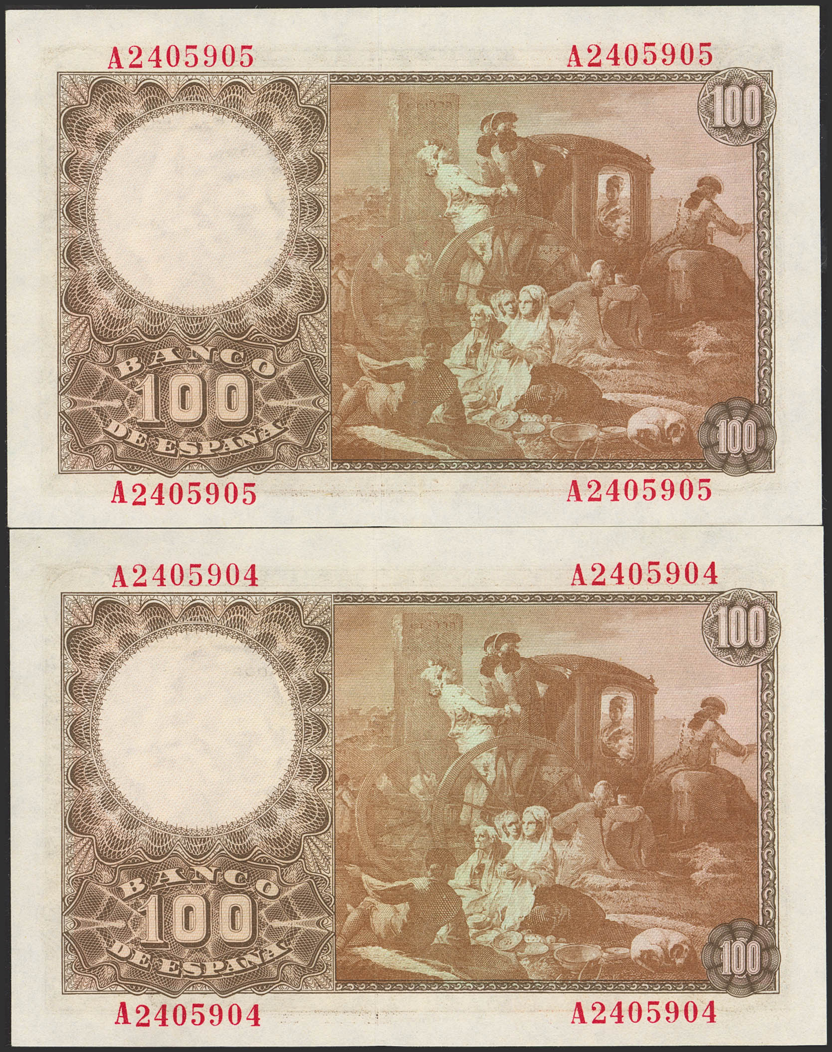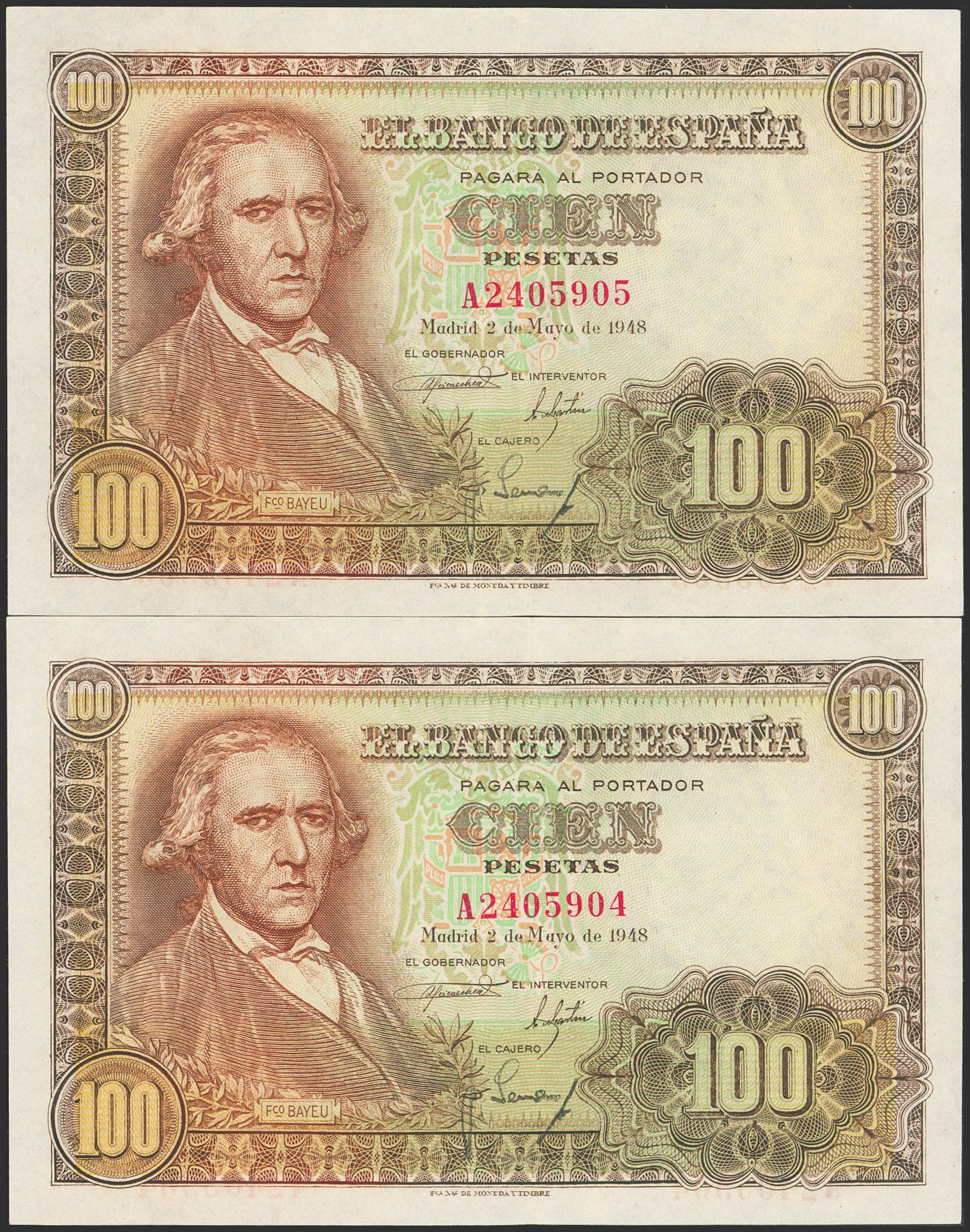 100 Pesetas. 2 de Mayo de 1948. Pareja correlativa. Serie A. (Edifil 2023: 456a). Apresto original. EBC+.