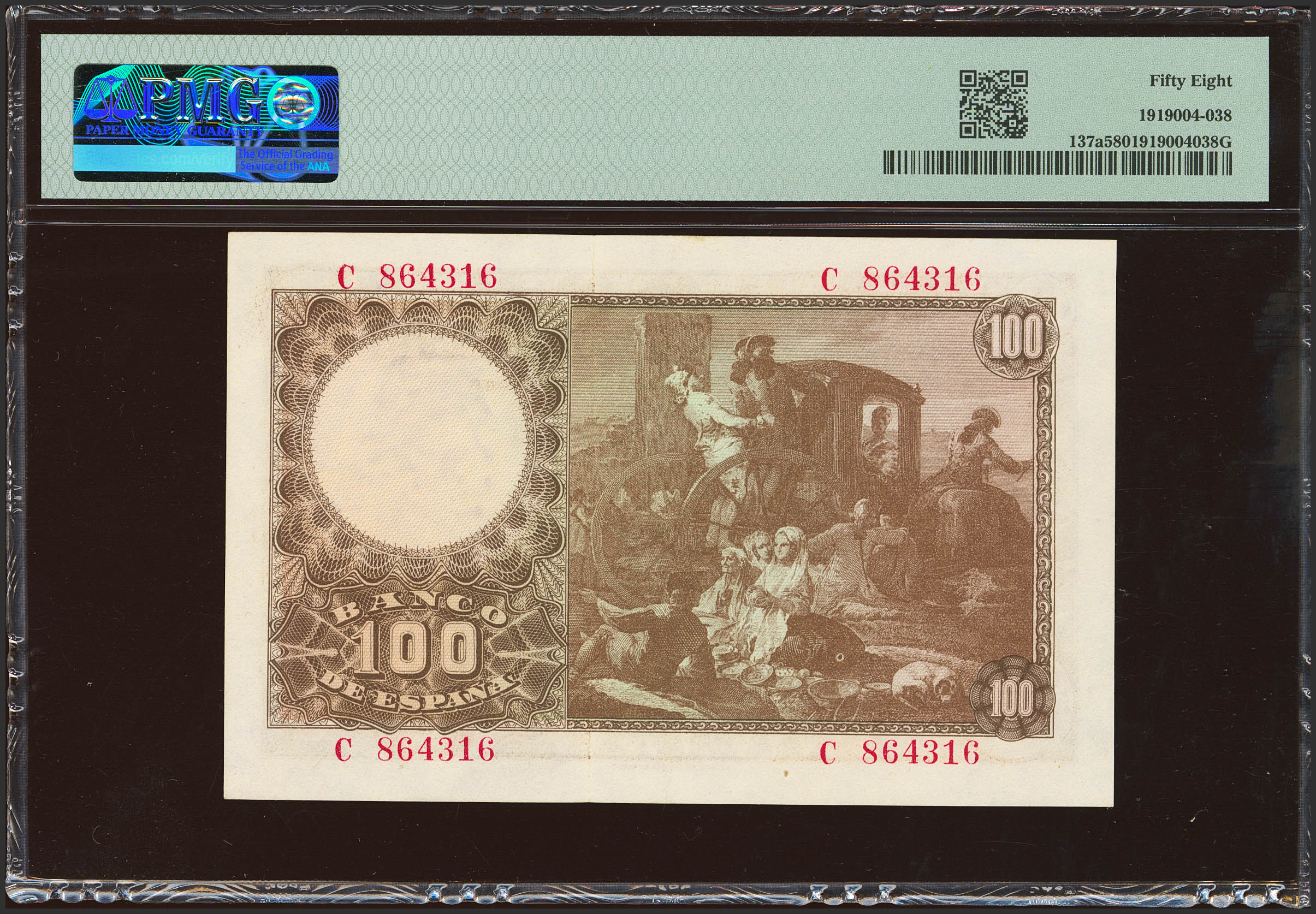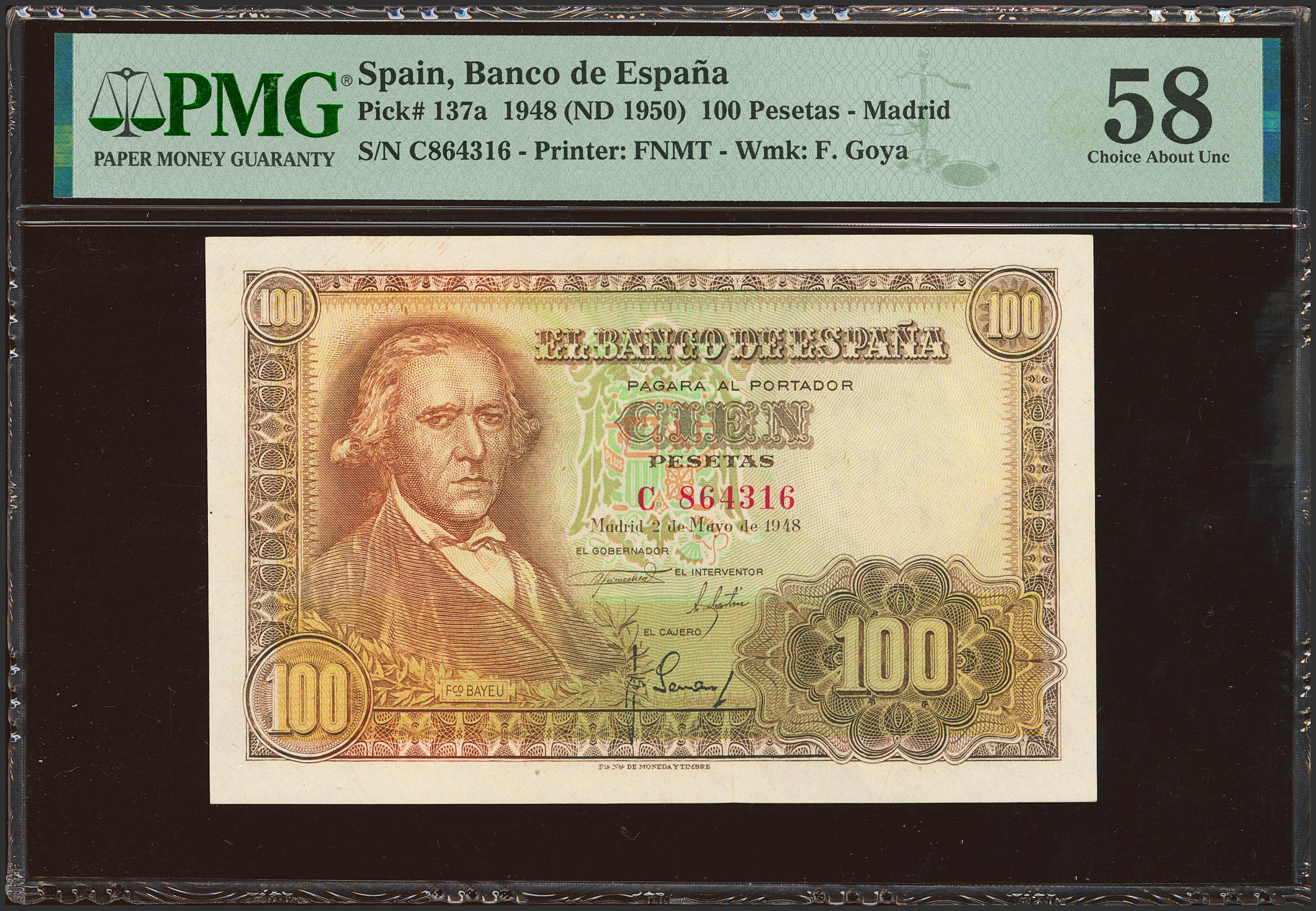 100 Pesetas. 2 de Mayo de 1948. Serie C. (Edifil 2023: 456a, Pick: 137a). EBC++. Encapsulado PMG58.