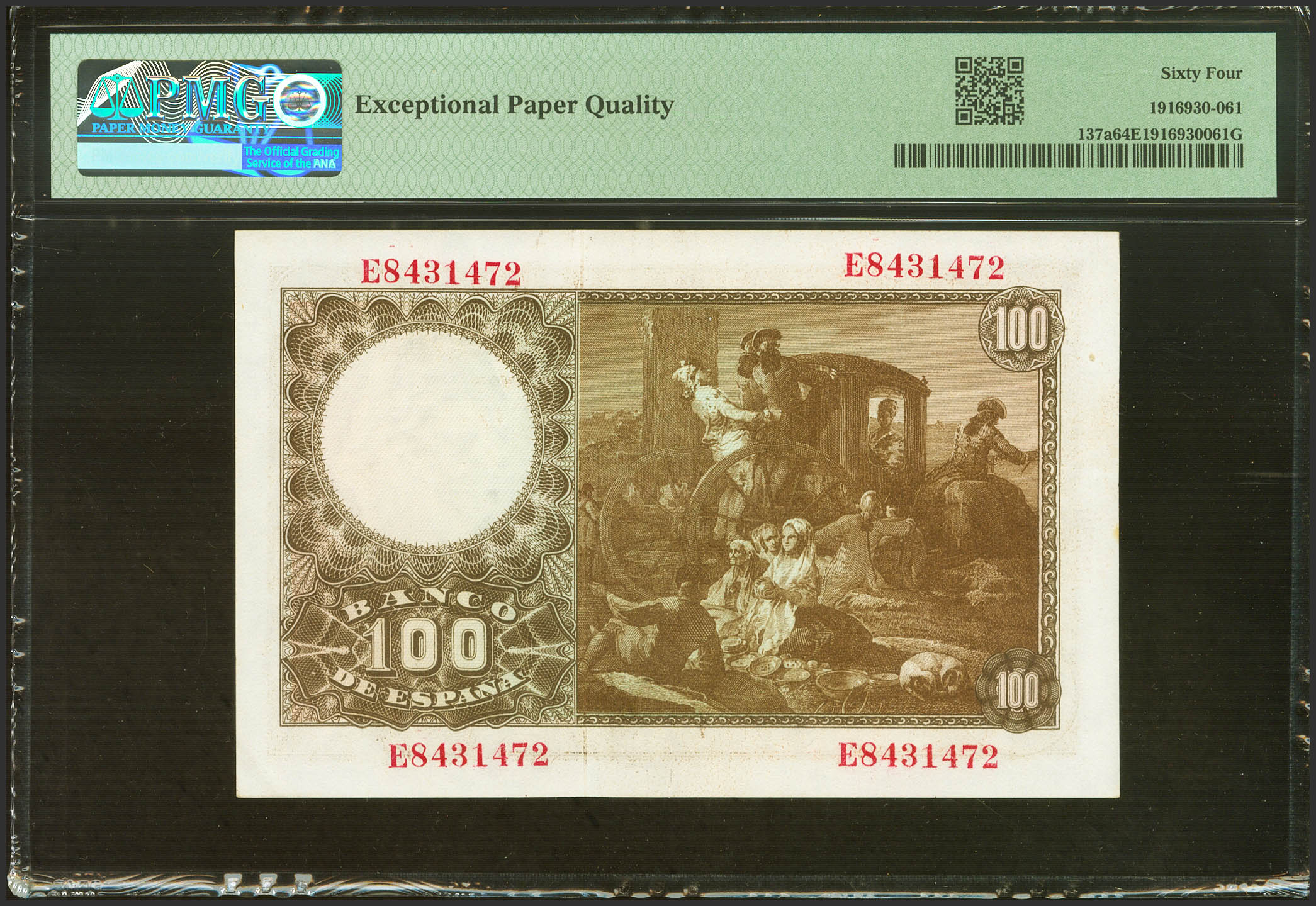 100 Pesetas. 2 de Mayo de 1948. Serie E. (Edifil 2023: 456a, Pick: 137a). Apresto original. SC. Encapsulado PMG64EPQ.