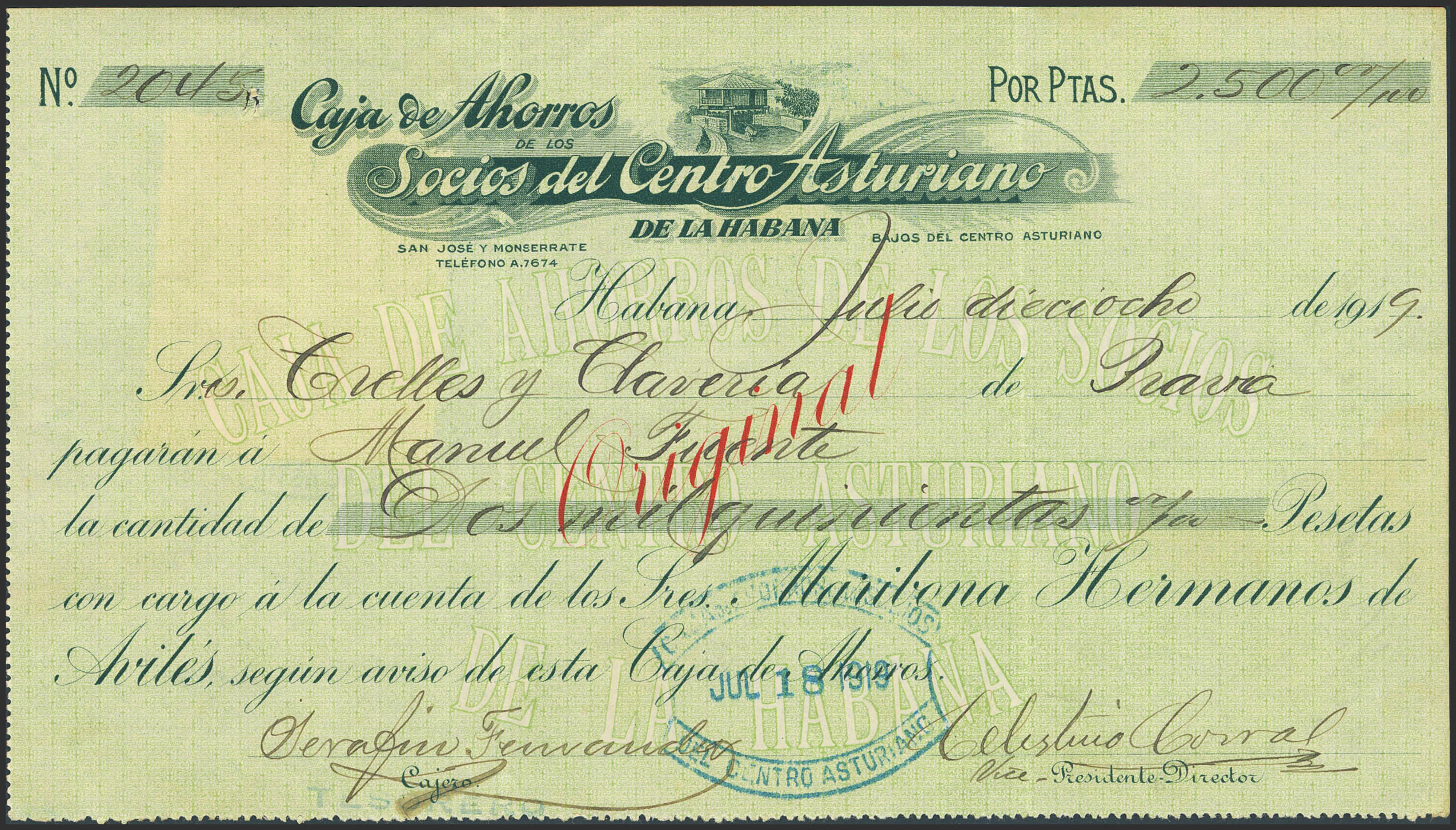 2500 Pesetas. Caja de Ahorros de los socios del Centro Asturiano de la Habana. 18 de Julio de 1919. SC--.