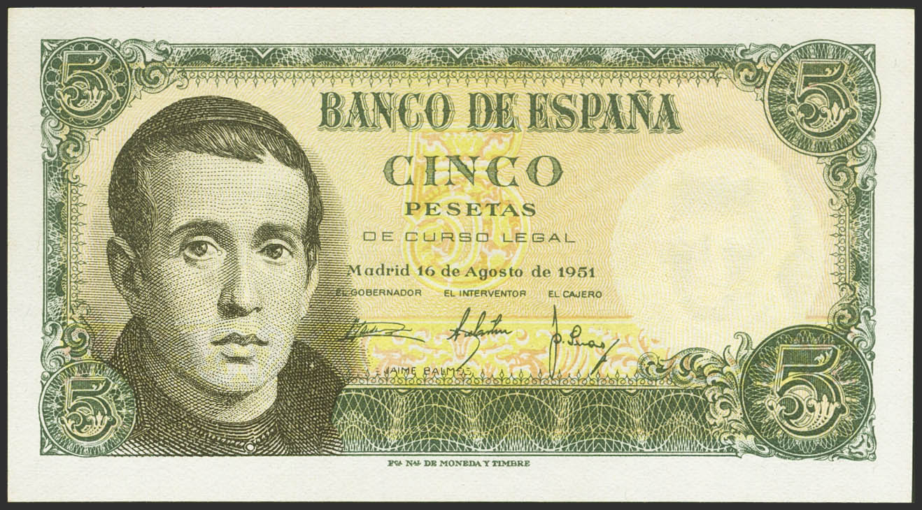 5 Pesetas. 16 de Agosto de 1951. Sin serie. (Edifil 2021: 459). Apresto original. SC.