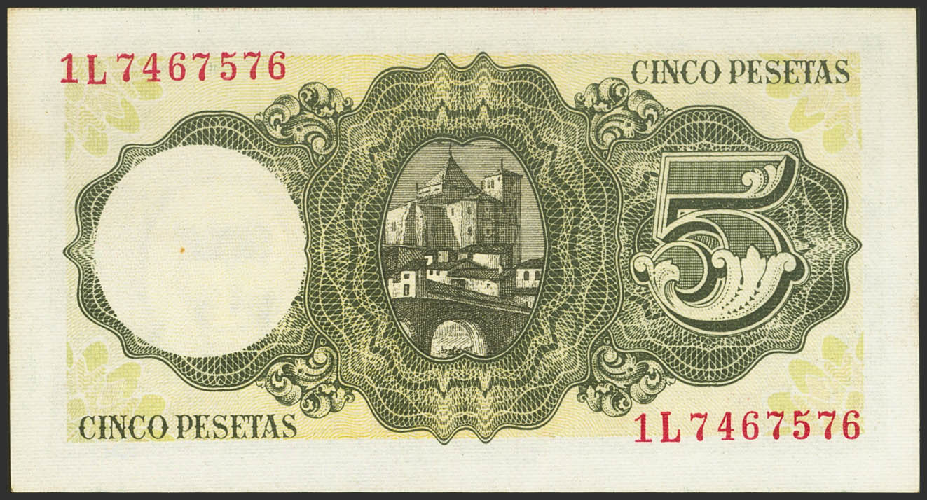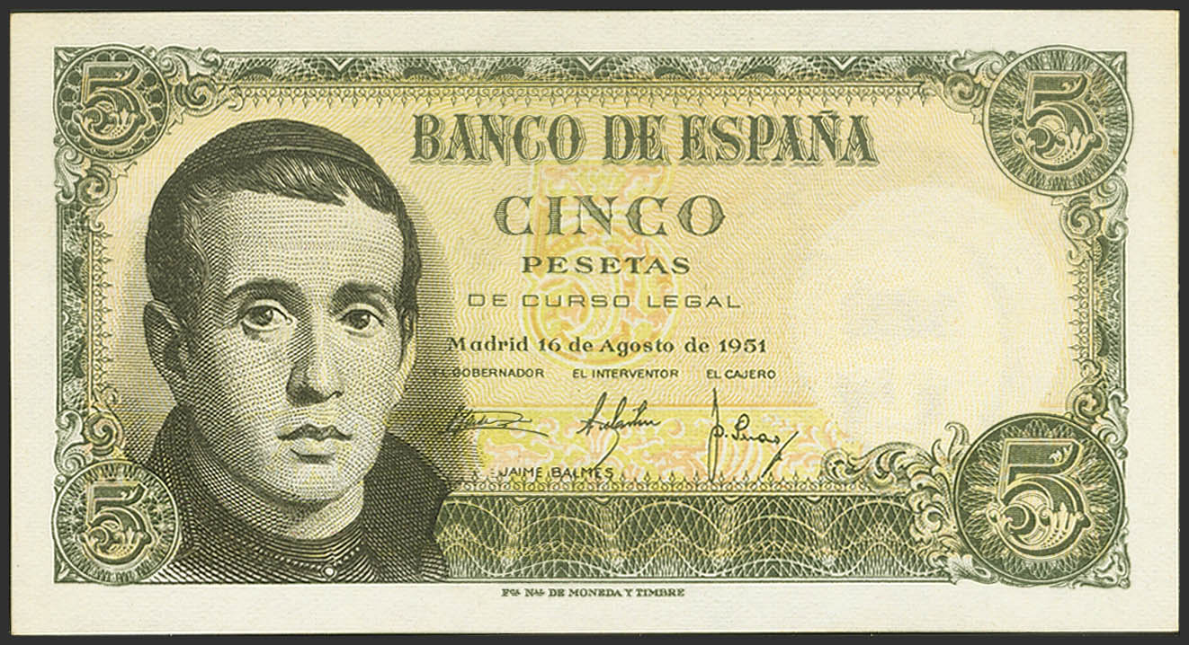 5 Pesetas. 16 de Agosto de 1951. Serie 1L, última serie emitida. (Edifil 2023: 459b). Apresto original. SC-.