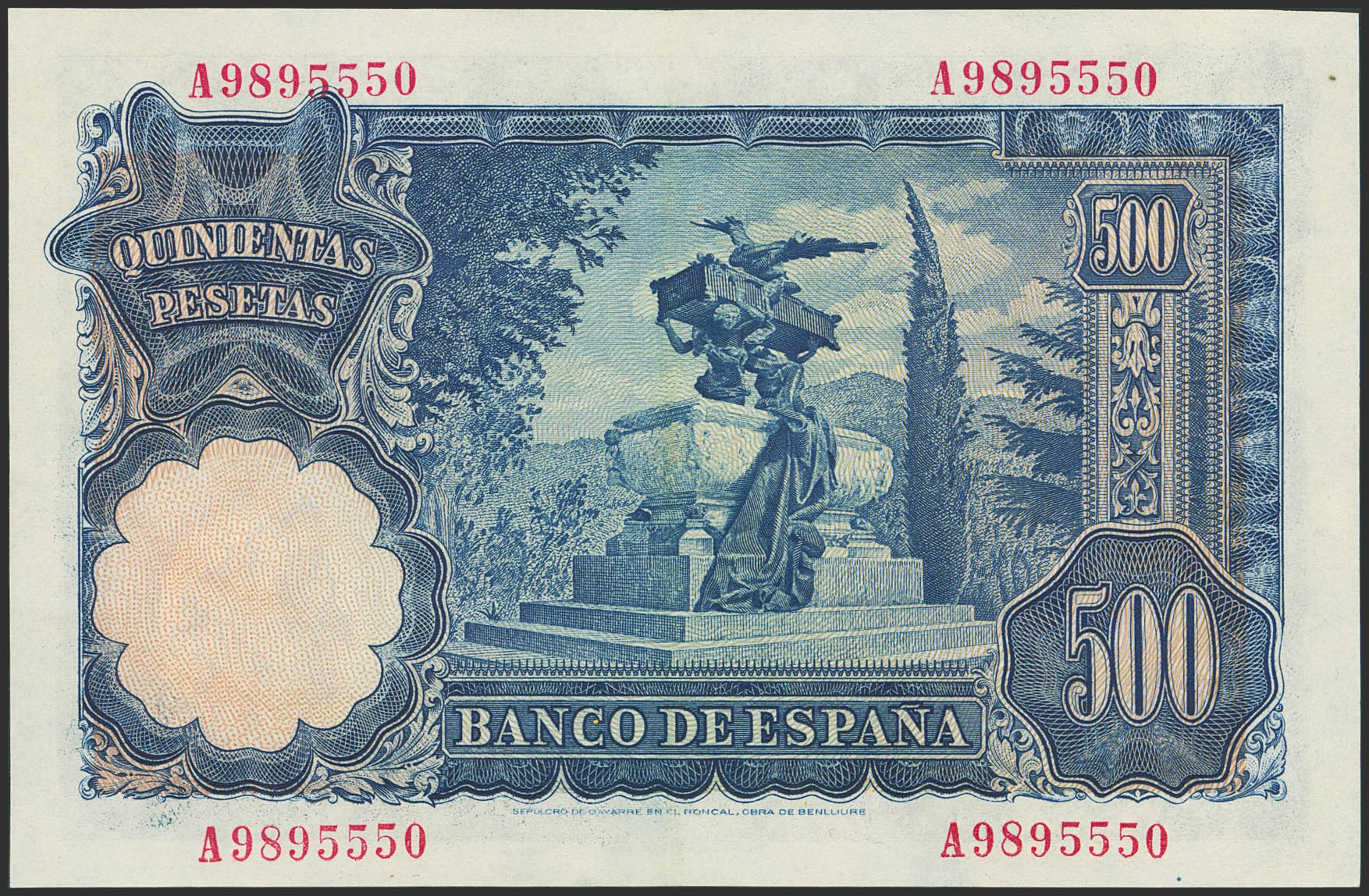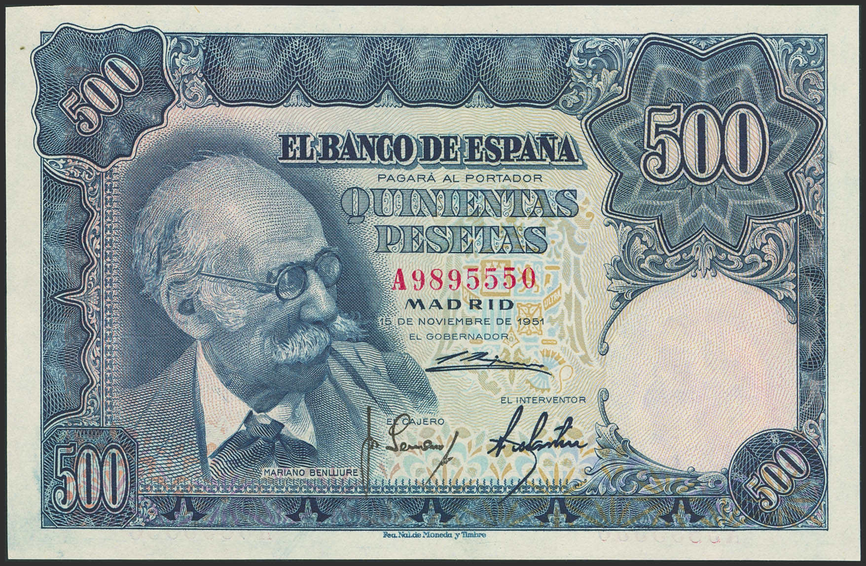500 Pesetas. 15 de Noviembre de 1951. Serie A. (Edifil 2023: 460a). Conserva gran parte del apresto original. EBC+++.