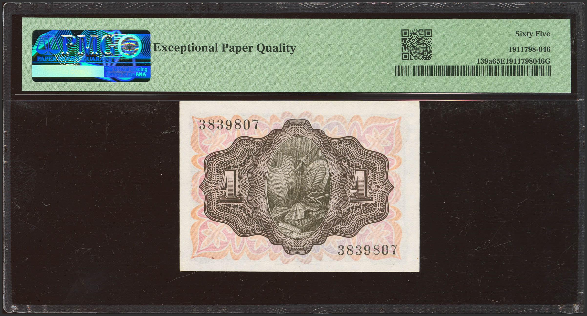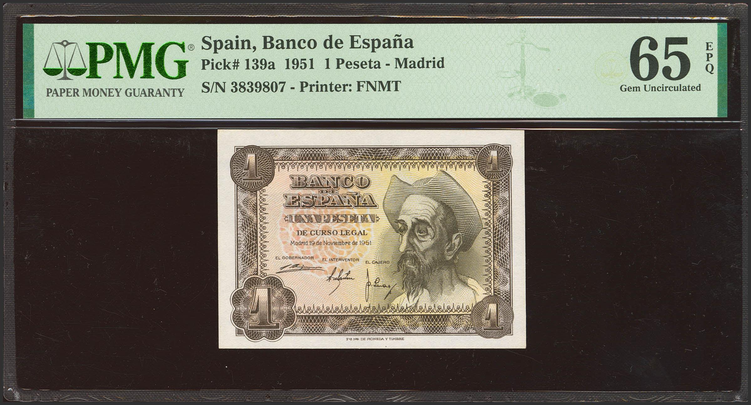 1 Peseta. 19 de Noviembre de 1951. Sin serie. (Edifil 2021: 461, Pick: 139a). Apresto original. SC. Encapsulado PMG65EPQ.