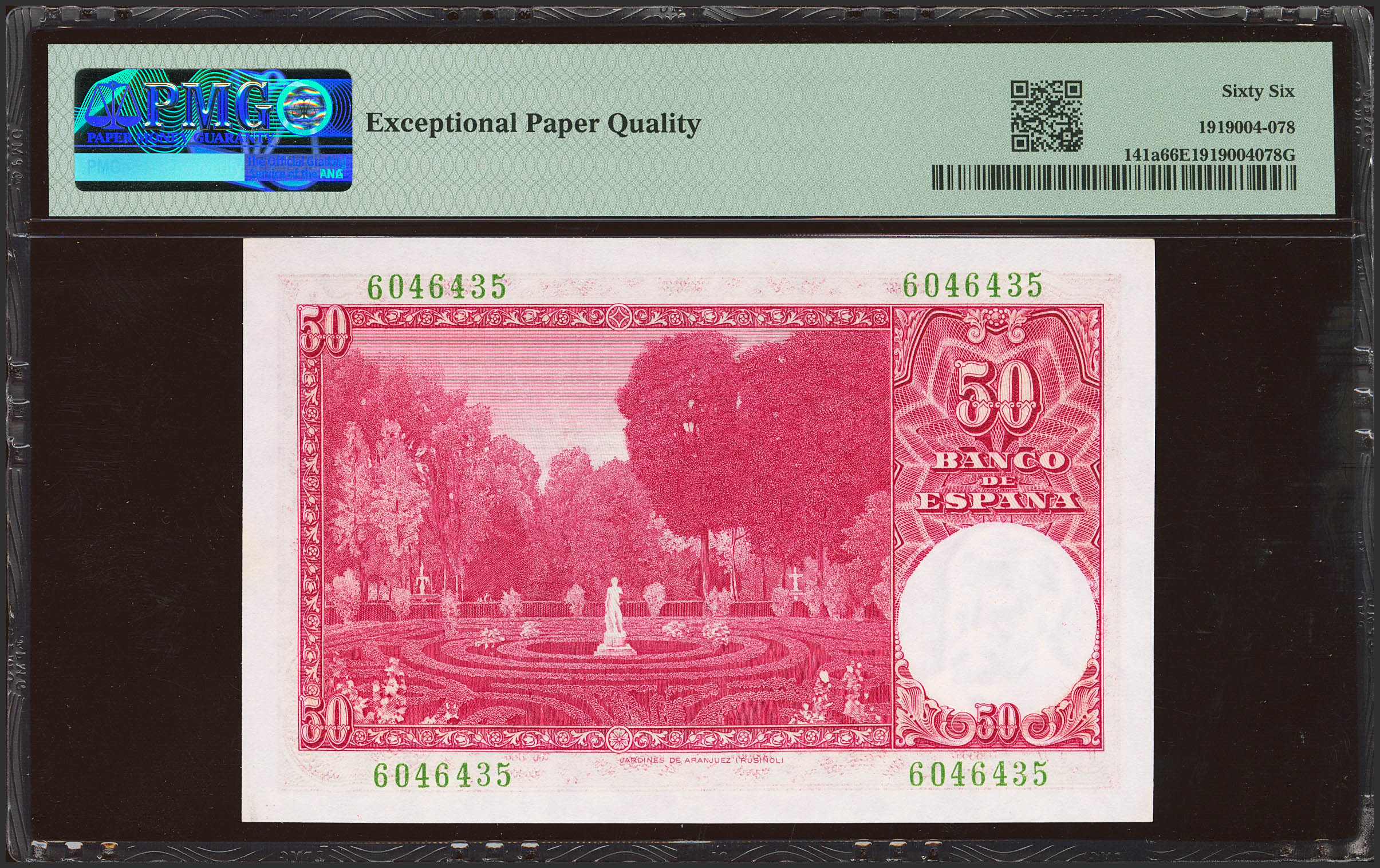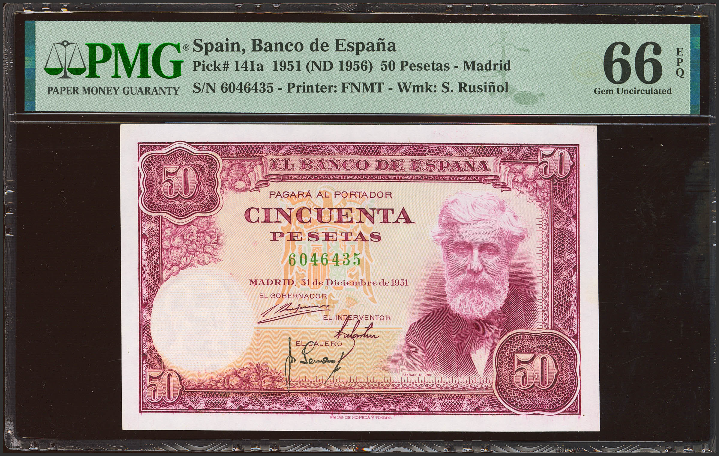 50 Pesetas. 31 de Diciembre de 1951. Sin serie. (Edifil 2023: 462, Pick: 141a). Apresto original. SC. Encapsulado PMG66EPQ.