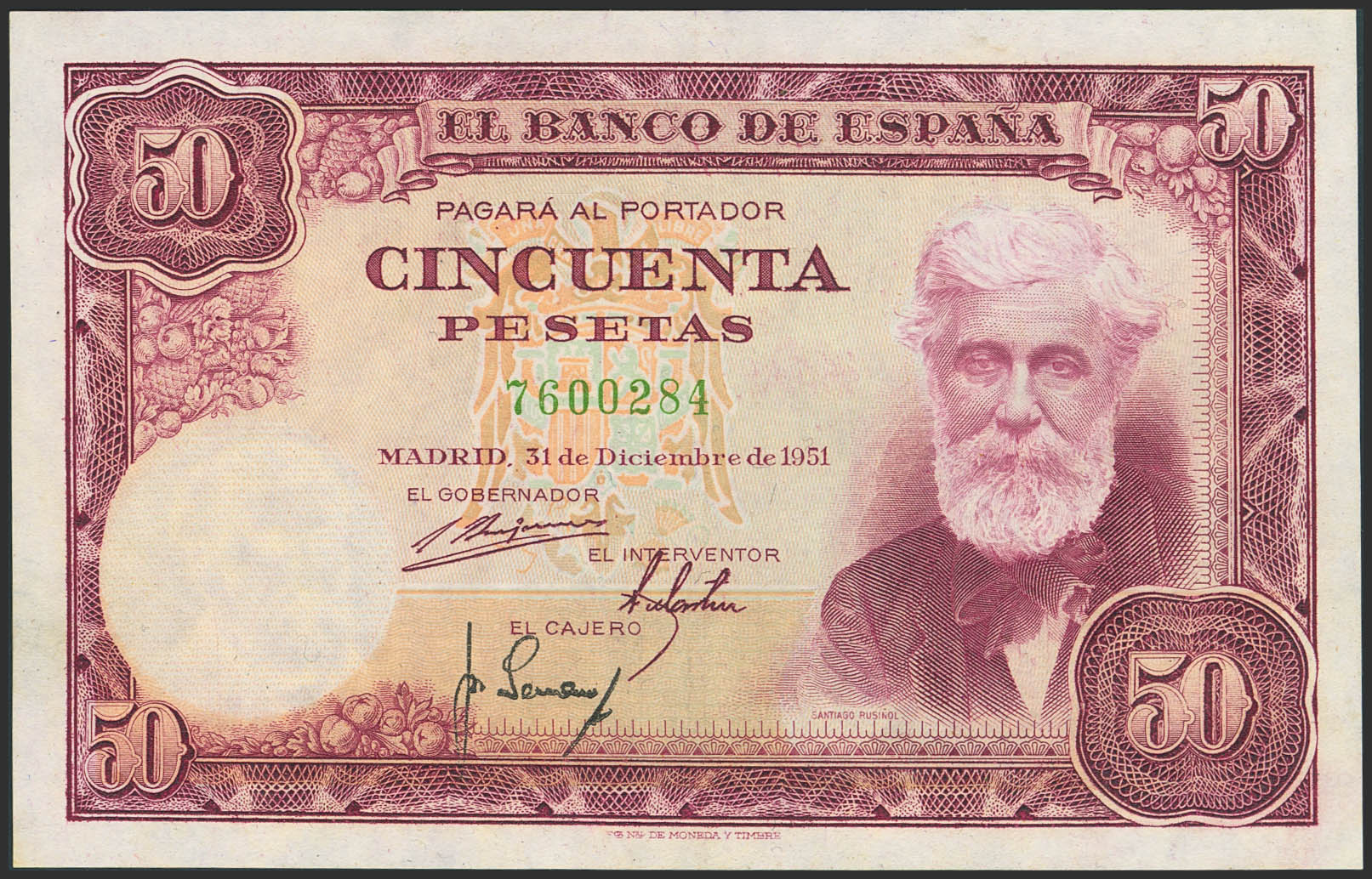 50 Pesetas. 31 de Diciembre de 1951. Sin serie. (Edifil 2023: 462). EBC.