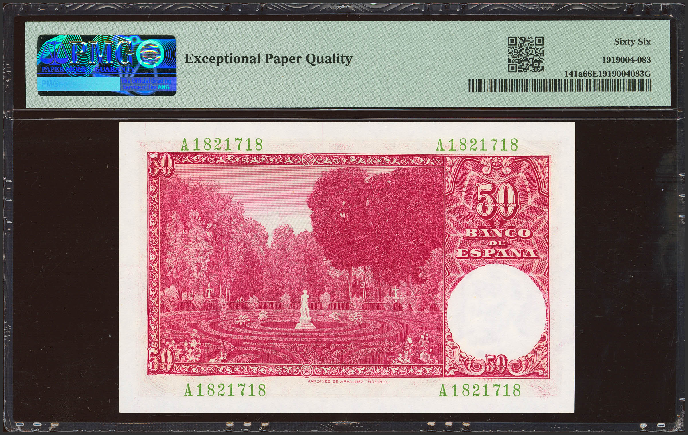 50 Pesetas. 31 de Diciembre de 1951. Serie A. (Edifil 2023: 462a, Pick: 141a). Raro en esta excepcional calidad, apresto original. SC. Encapsulado PMG66EPQ.