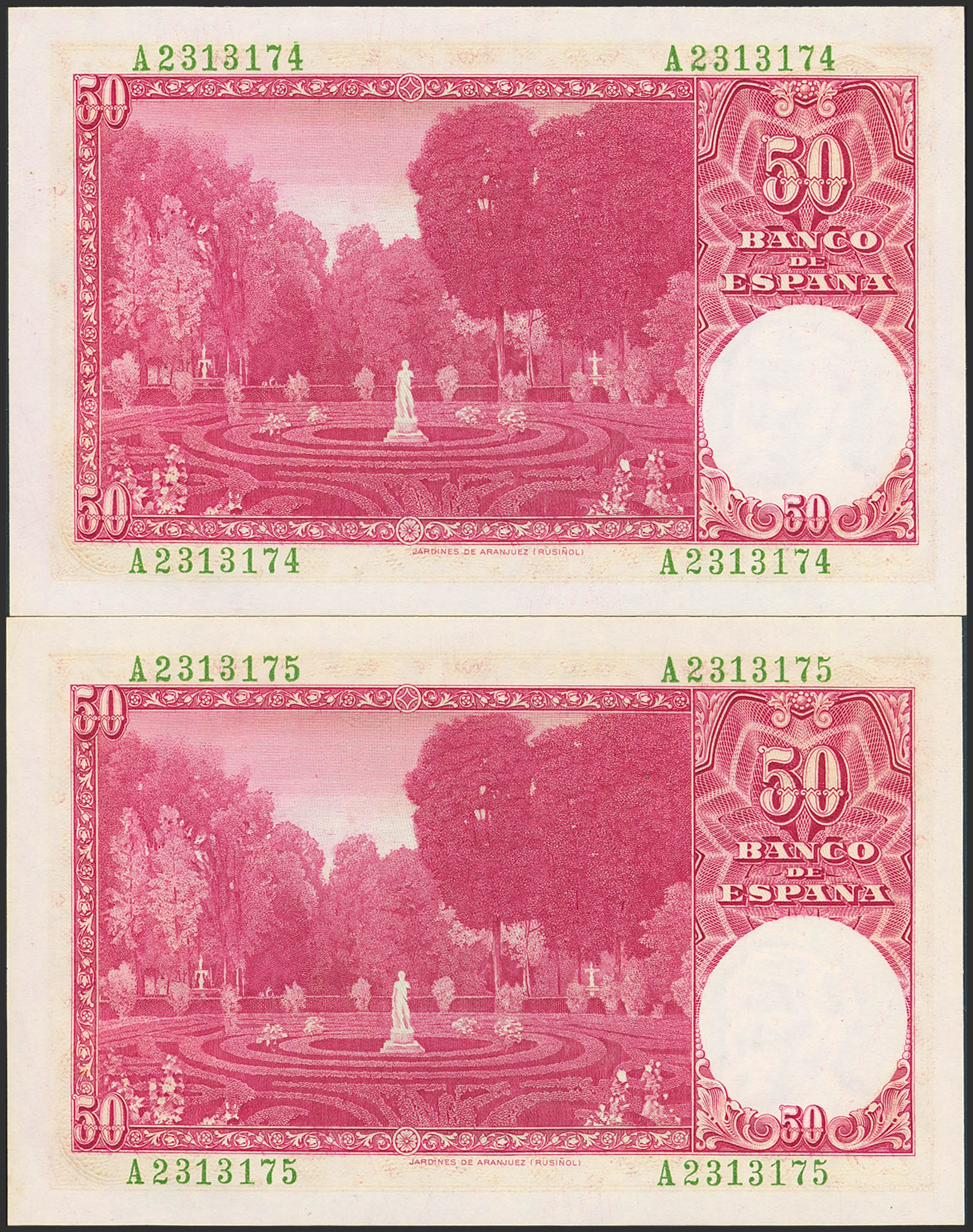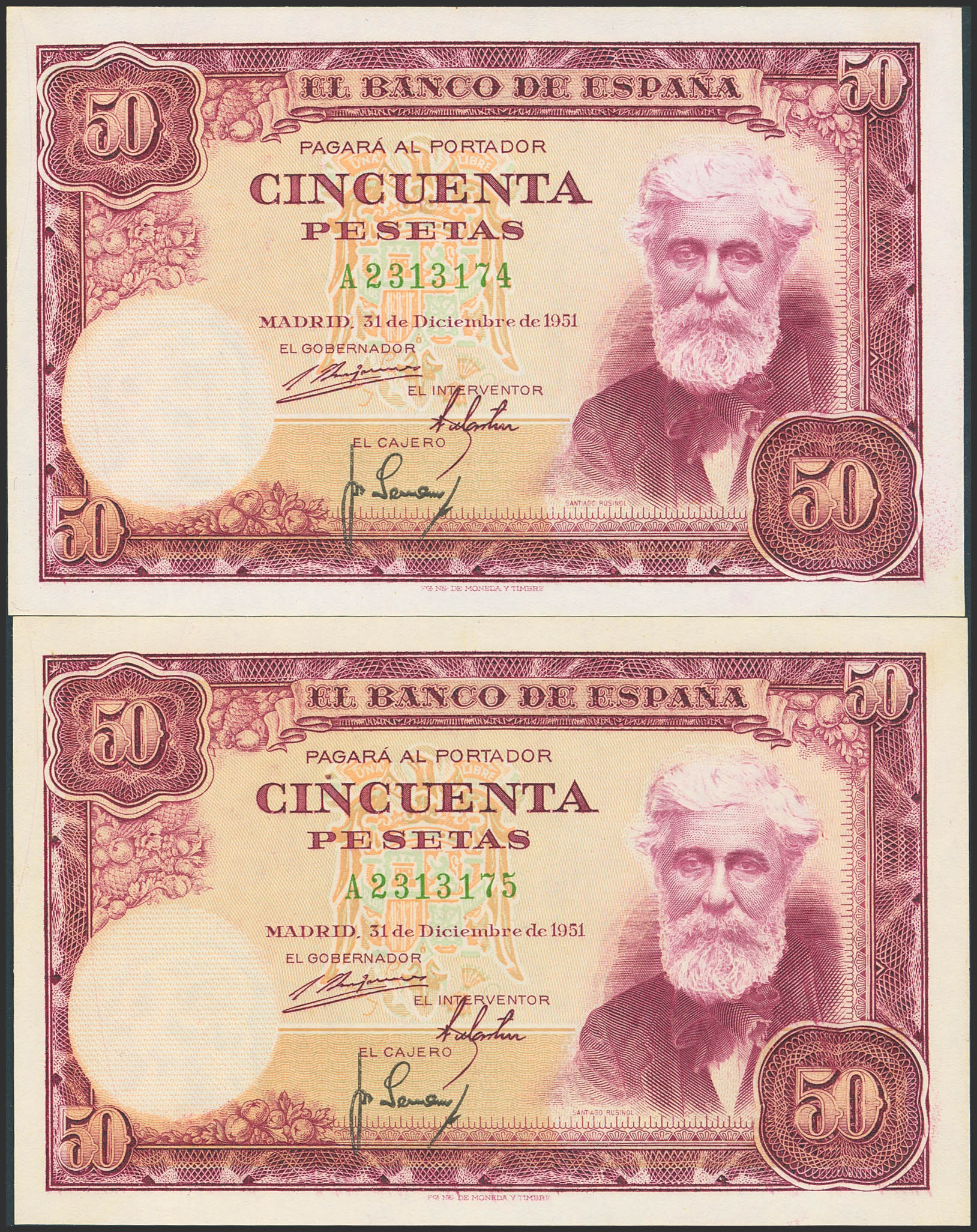 50 Pesetas. 31 de Diciembre de 1951. Pareja correlativa. Serie A. (Edifil 2021: 462a). Inusual en esta calidad, conserva todo su apresto original. SC.
