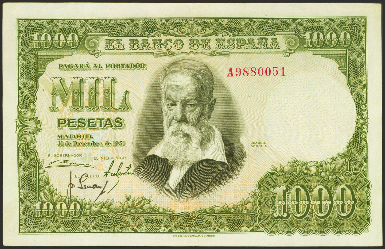 1000 Pesetas. 31 de Diciembre de 1951. Serie A. (Edifil 2021: 463a). Conserva gran parte de su apresto original. EBC.