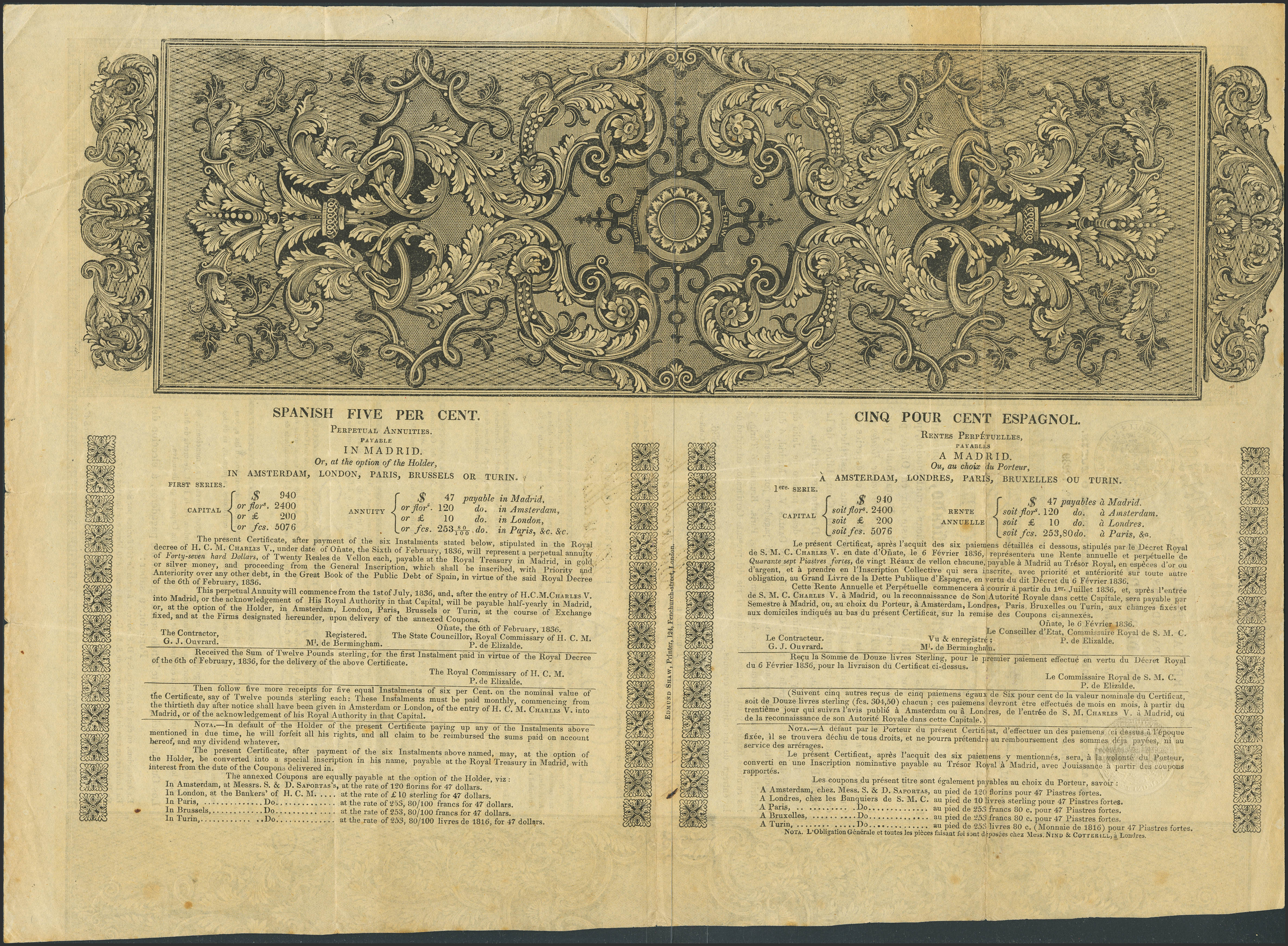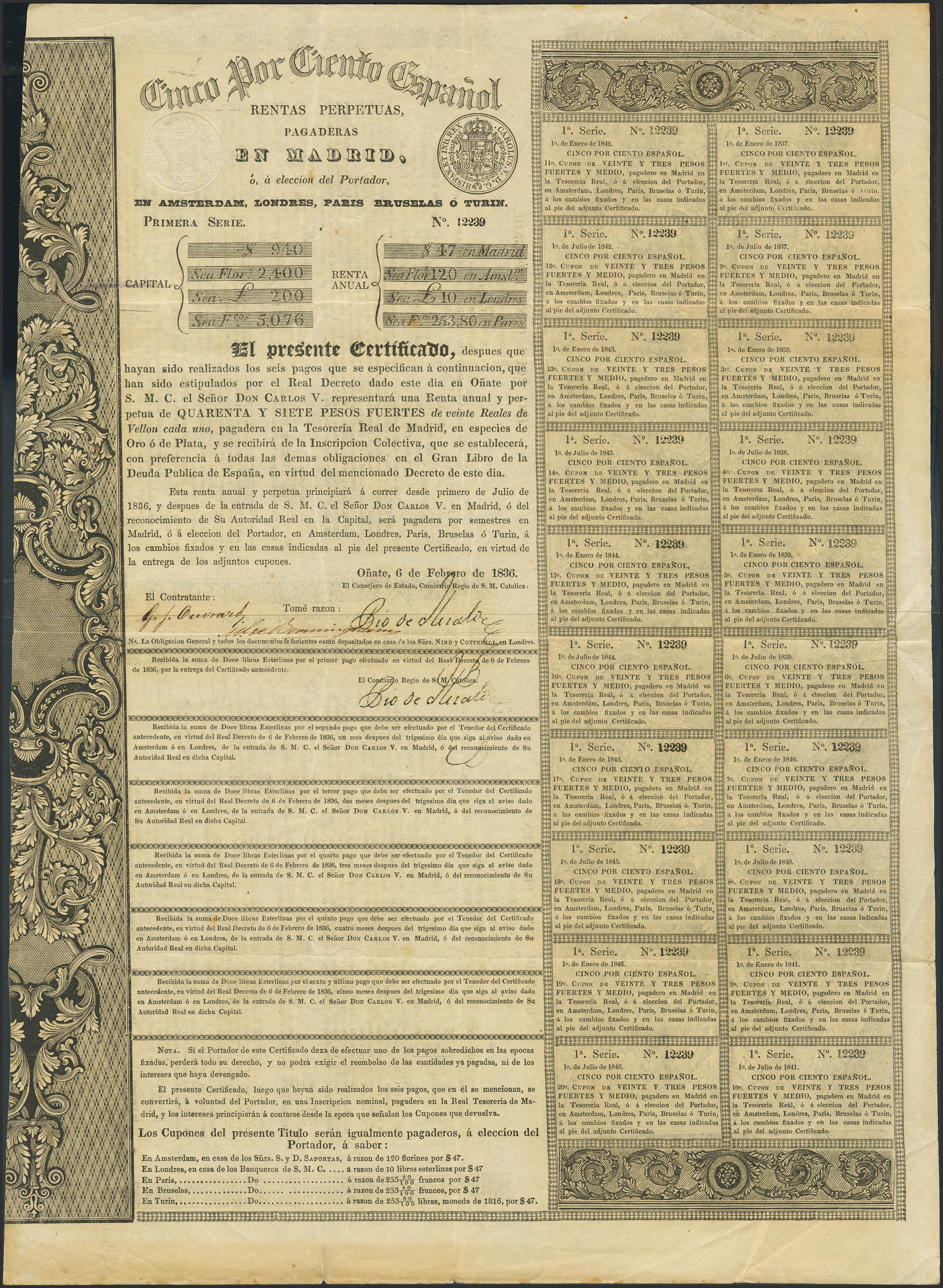47 Pesos Fuertes. Rentas Perpetuas. 6 de Febrero de 1836. (Edifil 2021: 20). Rarísimo, billete completo con cupones. EBC-.