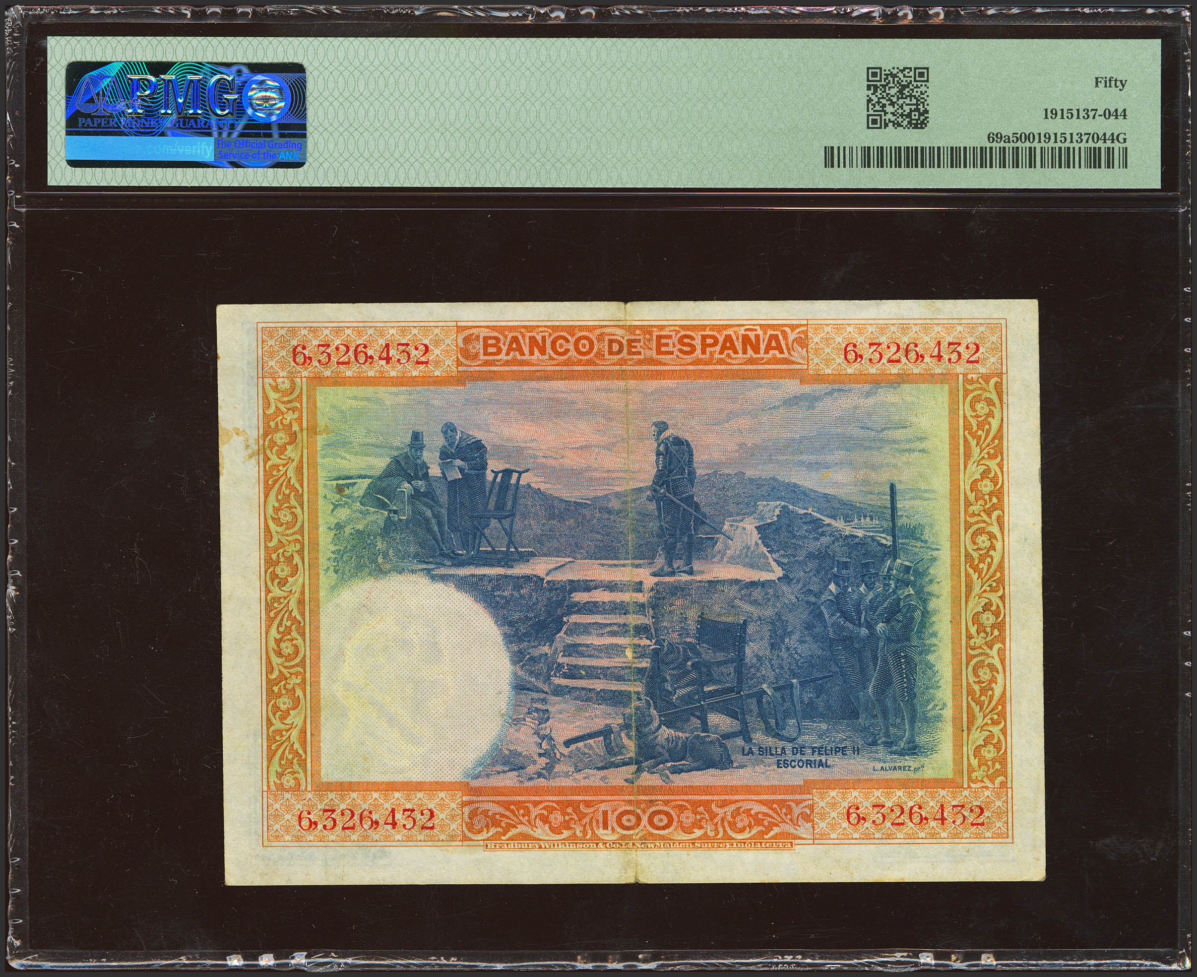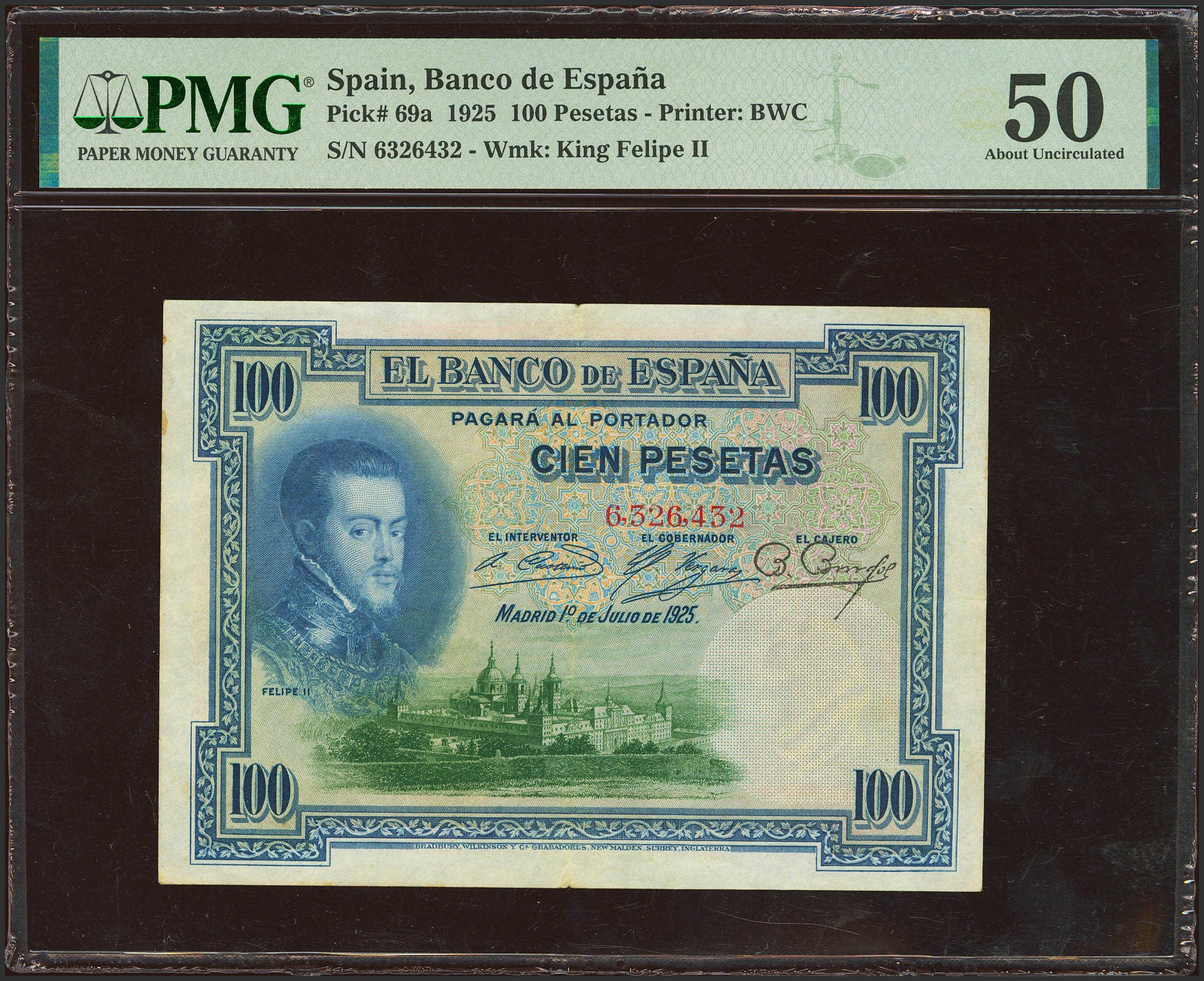 100 Pesetas. 1 de Julio de 1925. Sin serie. (Edifil 2023: 323, Pick: 69a). Inusual en esta calidad. EBC. Encapsulado PMG50.