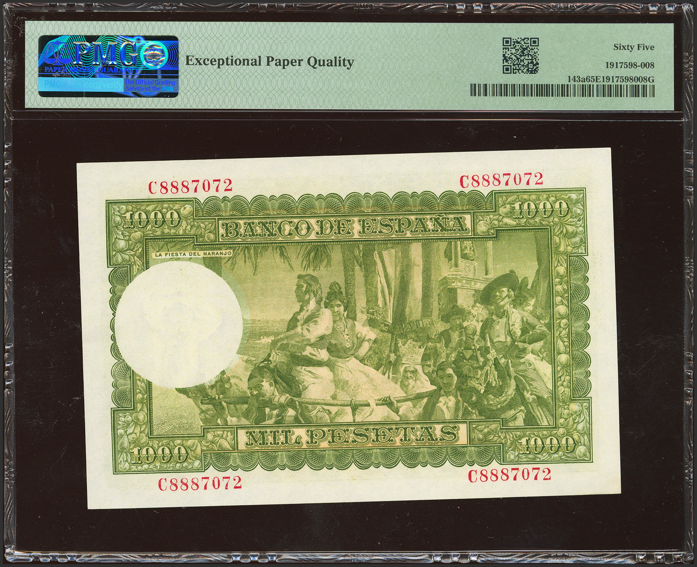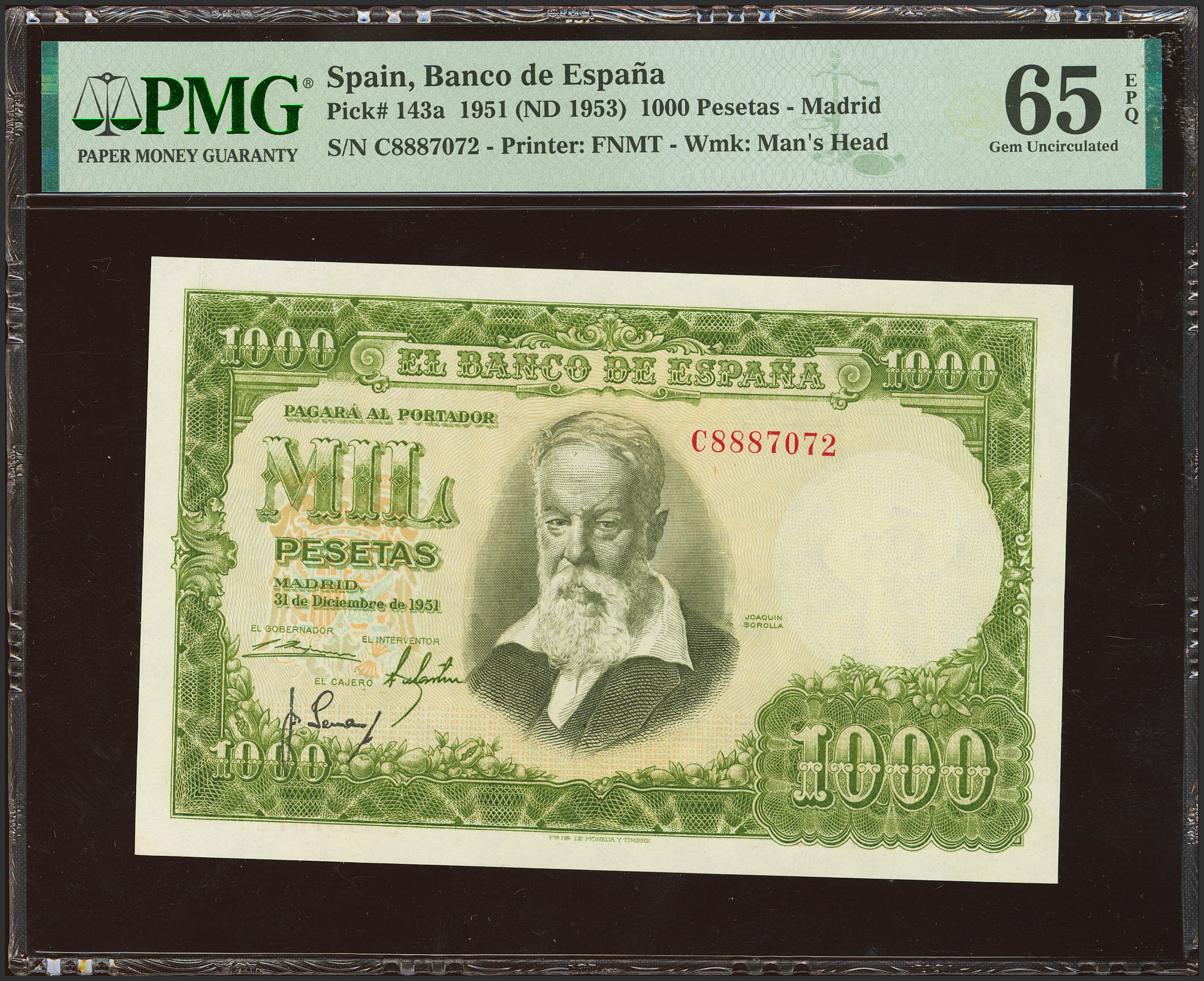 1000 Pesetas. 31 de Diciembre de 1951. Serie C, última serie emitida. (Edifil 2023: 463b, Pick: 143a). Raro en esta excepcional calidad, apresto original. SC. Encapsulado PMG65EPQ.