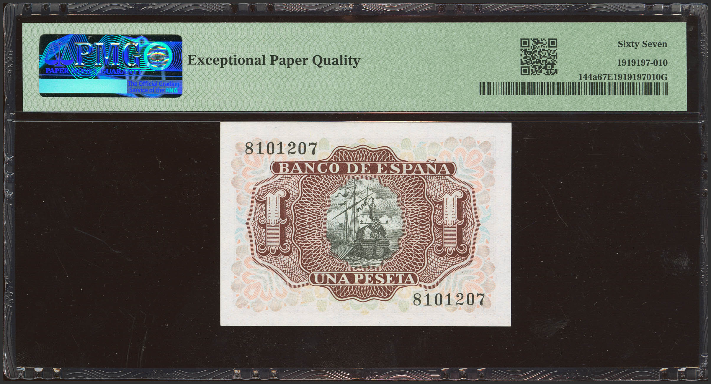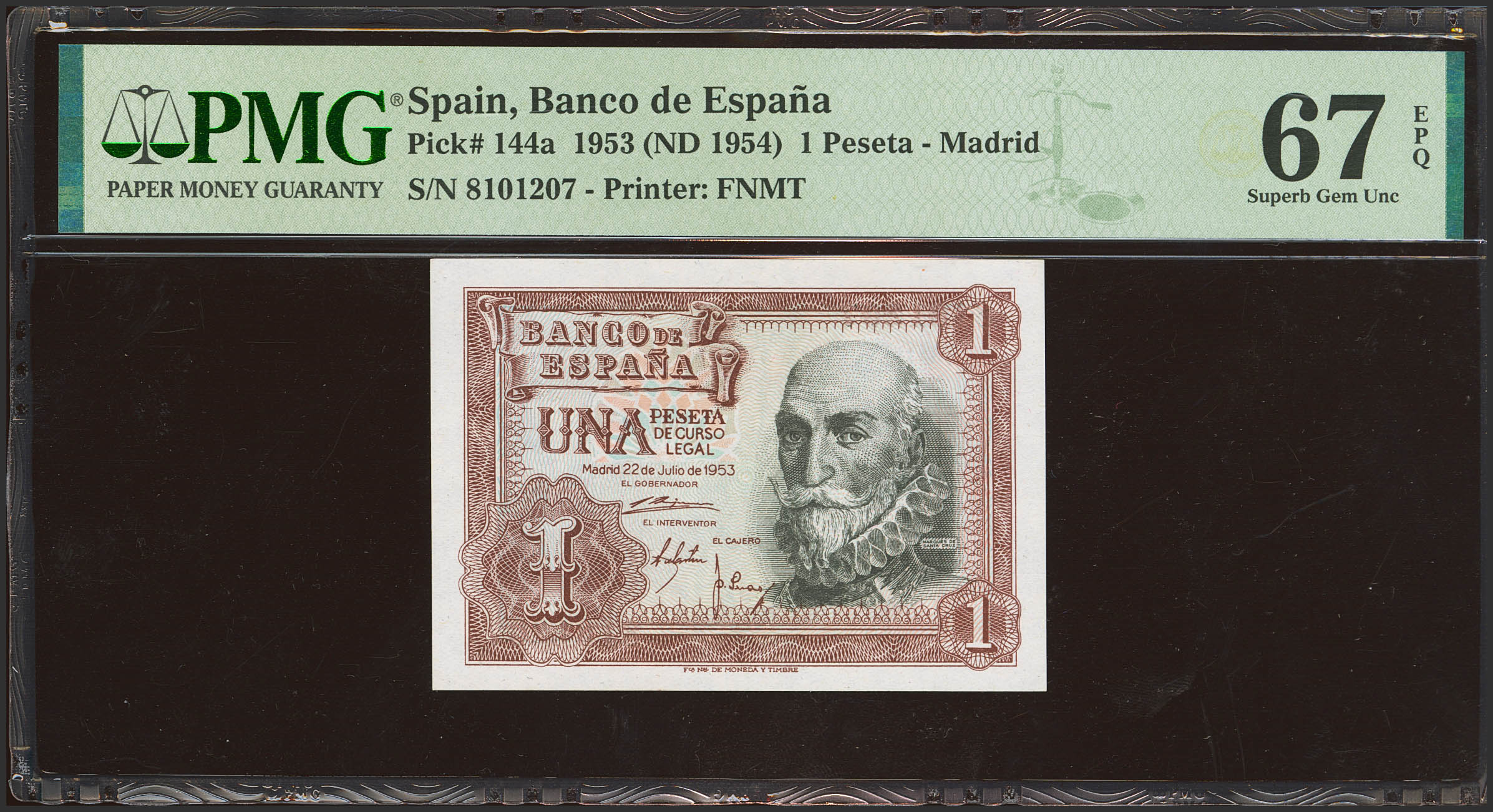 1 Peseta. 22 de Julio de 1953. Sin serie. (Edifil 2023: 465, Pick: 144a). Apresto original. SC. Encapsulado PMG67EPQ.