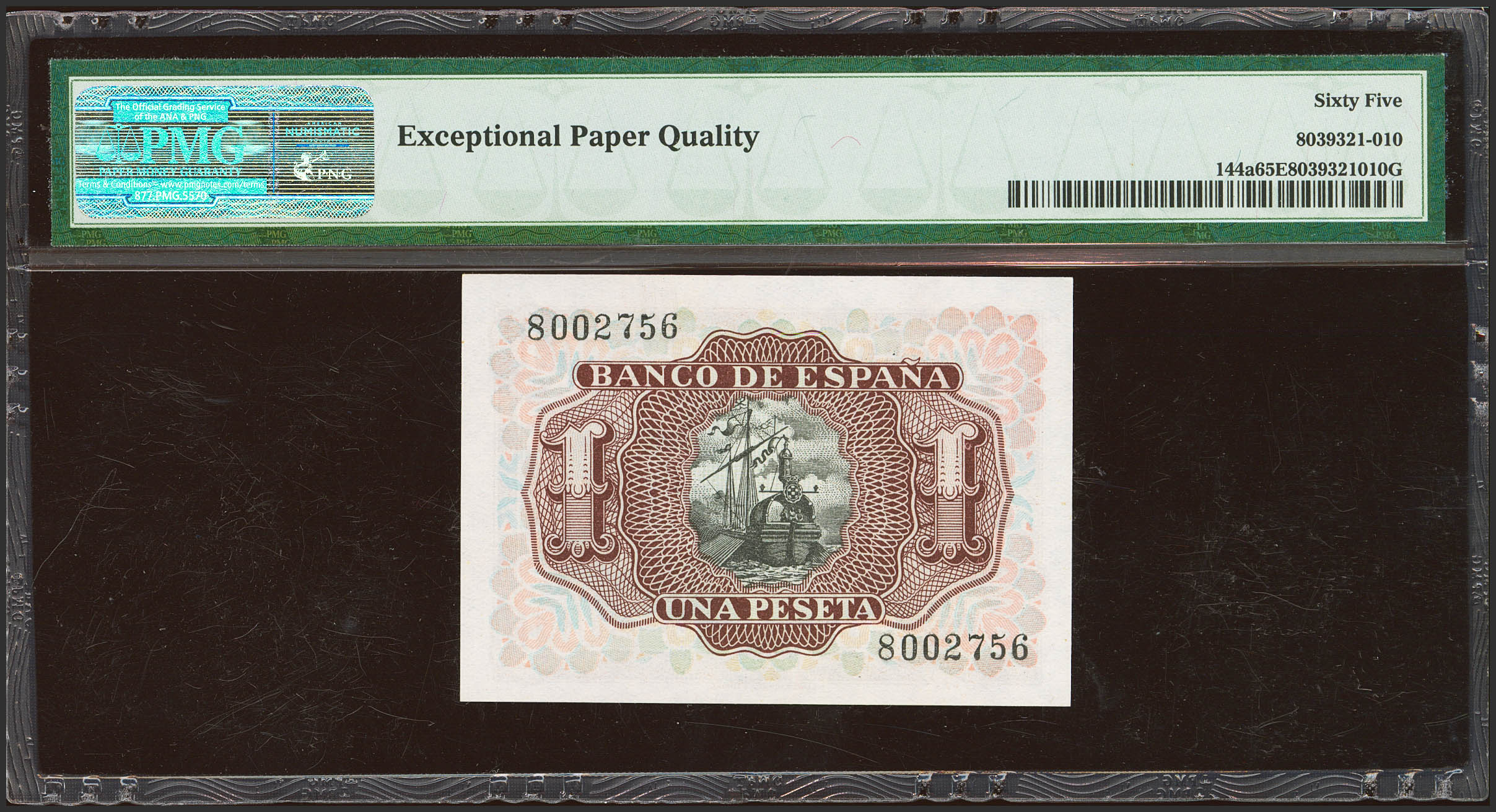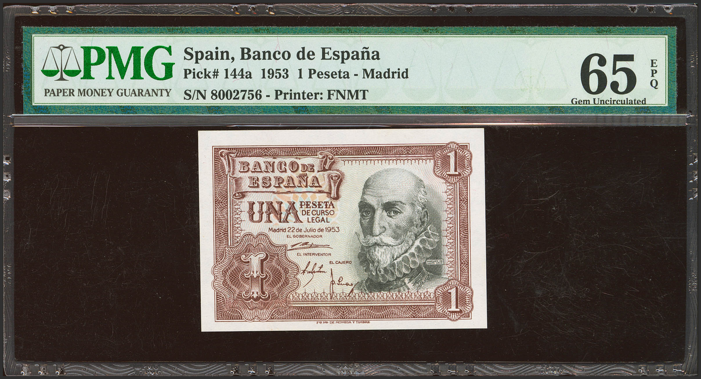 1 Peseta. 22 de Julio de 1953. Sin serie. (Edifil 2023: 465, Pick: 144a). Raro en esta calidad, apresto original. SC. Encapsulado PMG65EPQ.