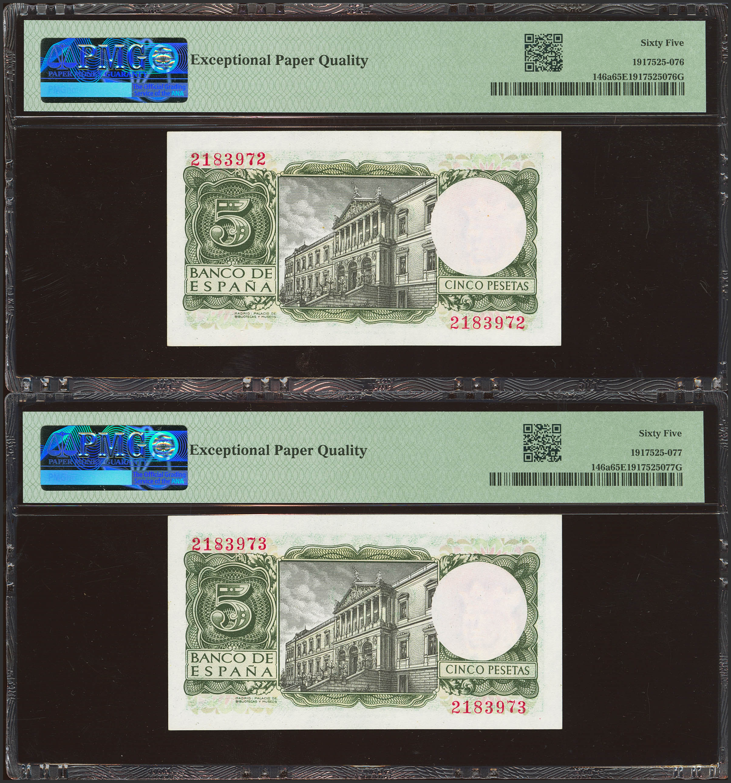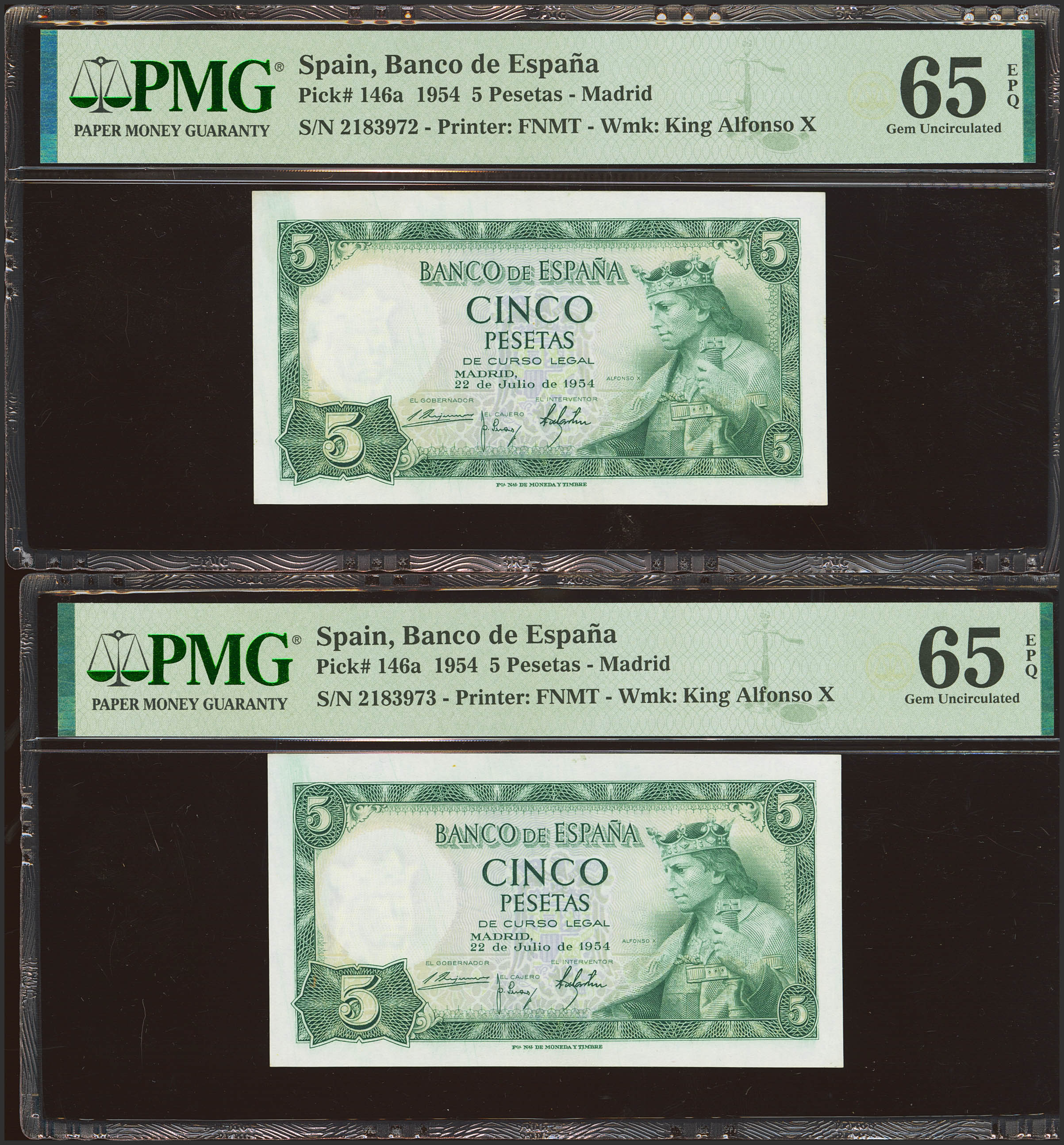 5 Pesetas. 22 de Julio de 1954. Pareja correlativa. Sin serie. (Edifil 2023: 466, Pick: 146a). Inusual en esta calidad, apresto original. SC. Encapsulado PMG65EPQ, ambos.