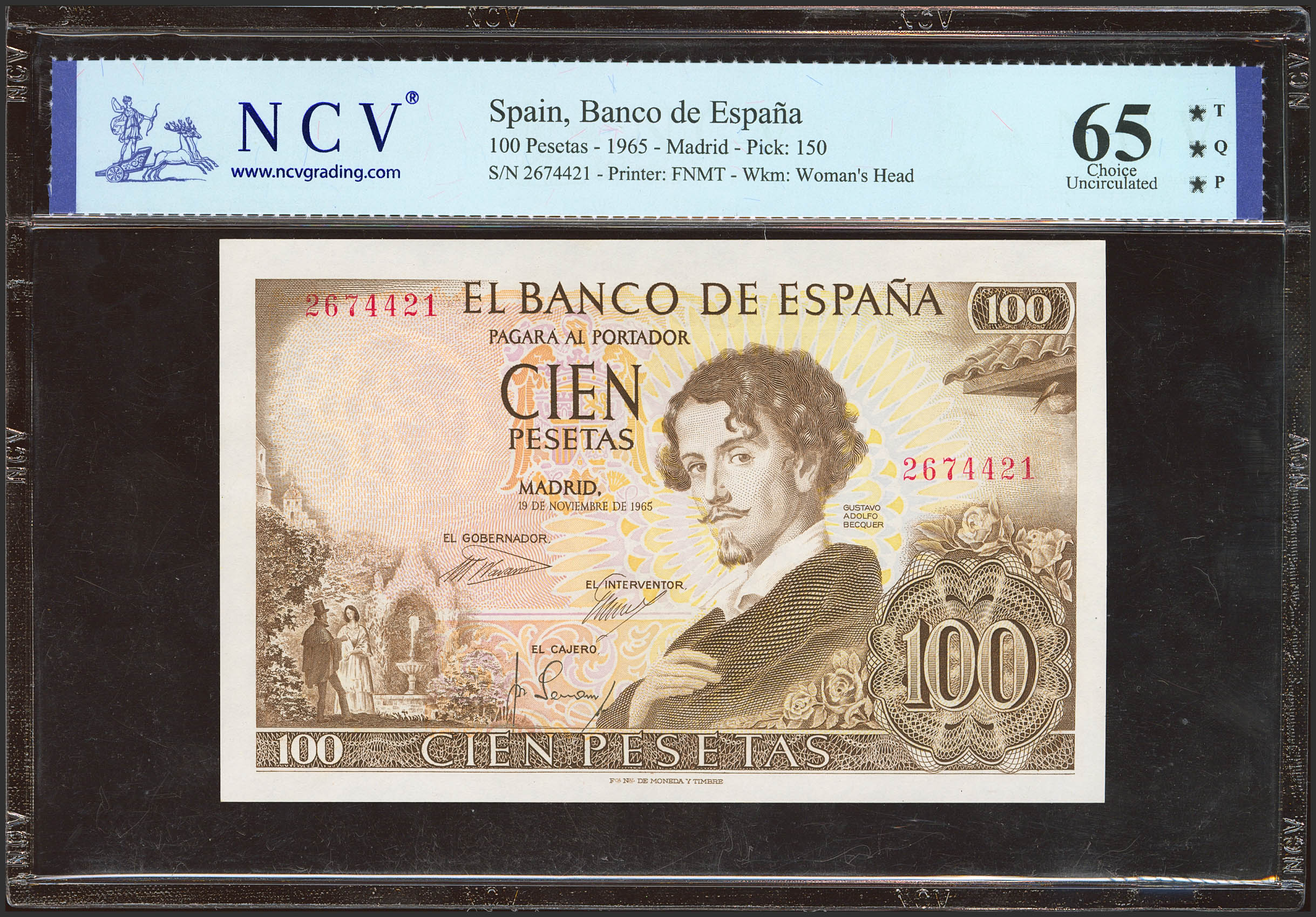 100 Pesetas. 19 de Noviembre de 1965. Sin serie. (Edifil 2023: 470, Pick: 150). Inusual, apresto original. SC. Encapsulado NCV65TQP.