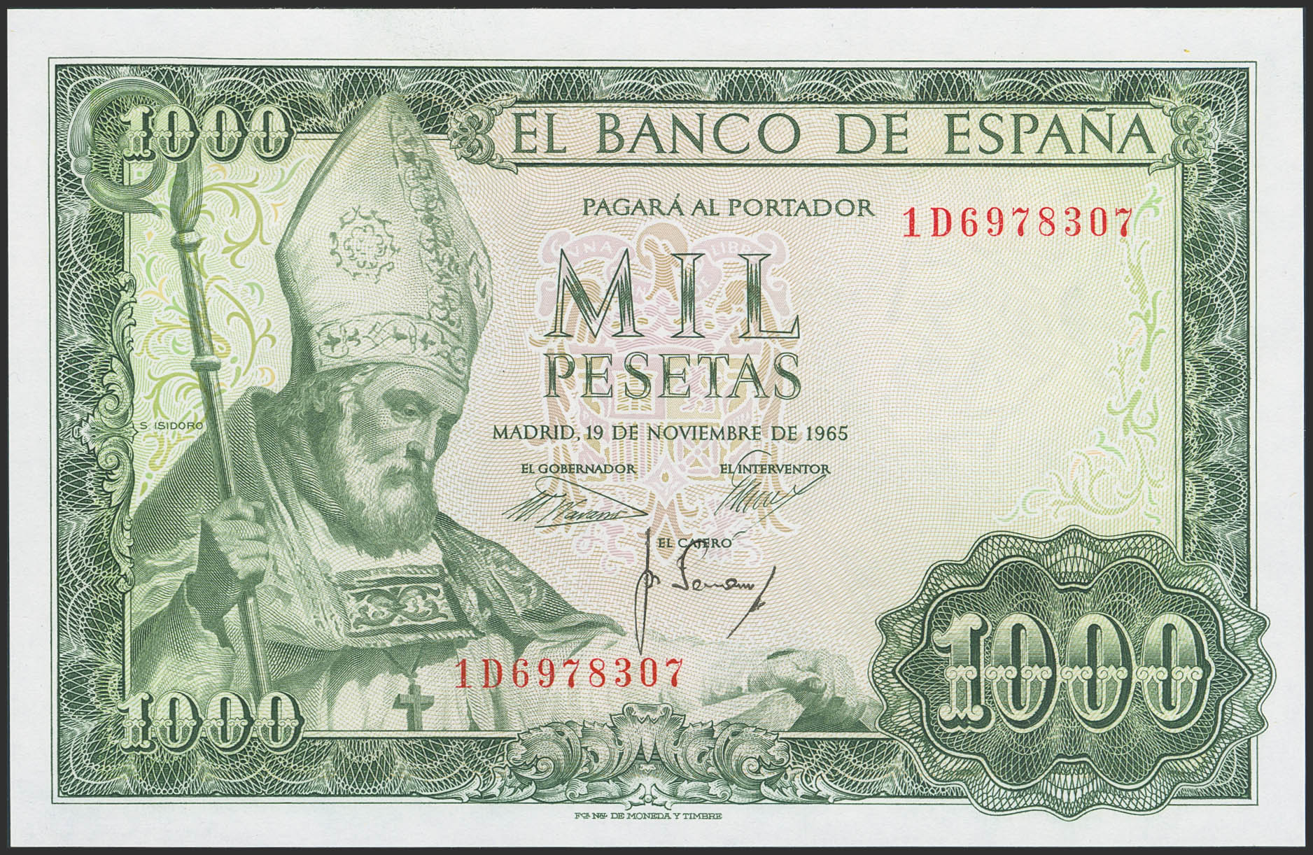 1000 Pesetas. 19 de Noviembre de 1965. Serie 1D. (Edifil 2023: 471b). Conserva todo su apresto original. SC-.