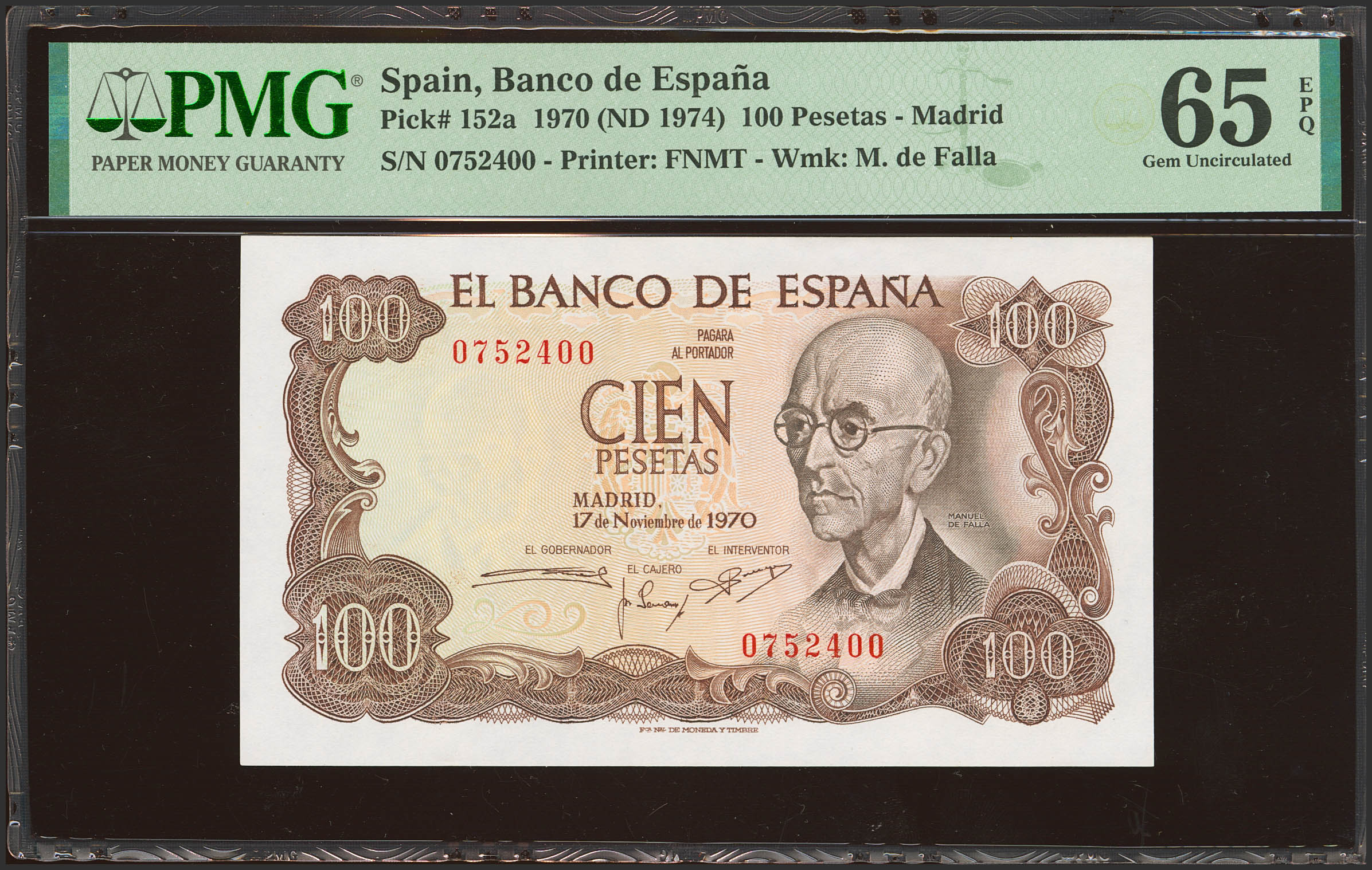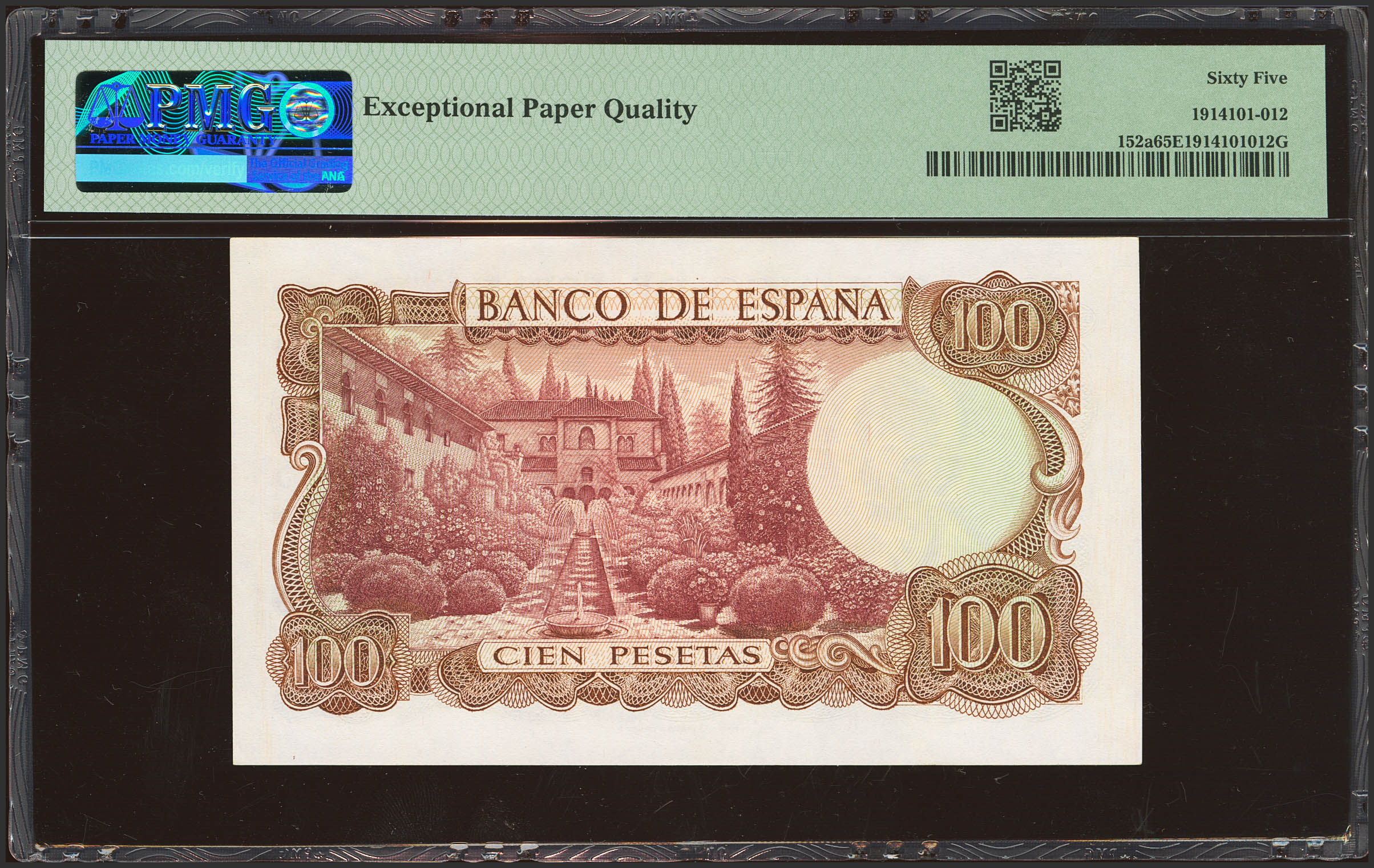100 Pesetas. 17 de Noviembre de 1970. Sin serie. (Edifil 2023: 472, Pick: 152a). Apresto original. SC. Encapsulado PMG65EPQ.
