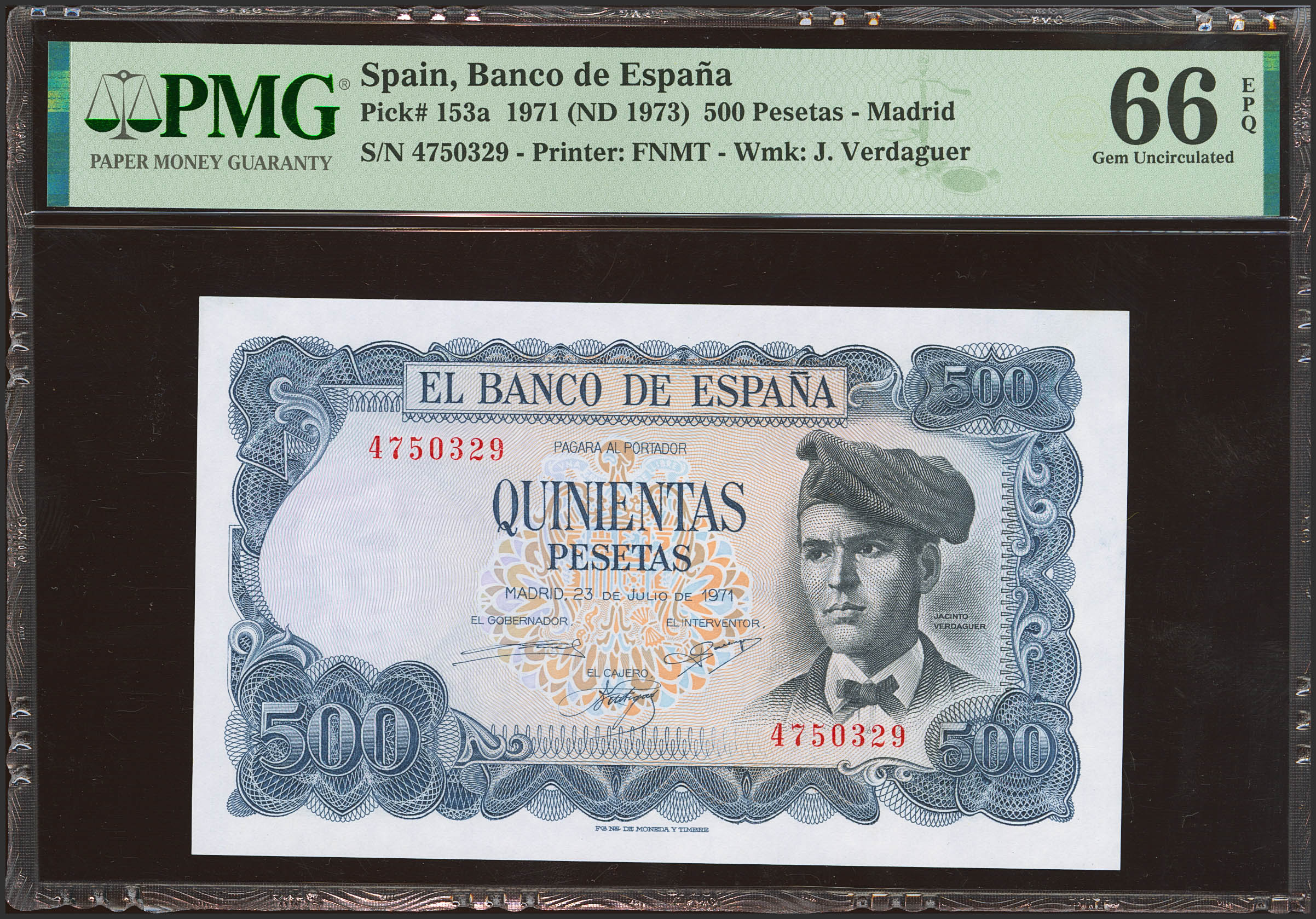 500 Pesetas. 23 de Julio de 1971. Sin serie. (Edifil 2021: 473, Pick: 153a). Raro en esta calidad, apresto original. Encapsulado PMG66EPQ.