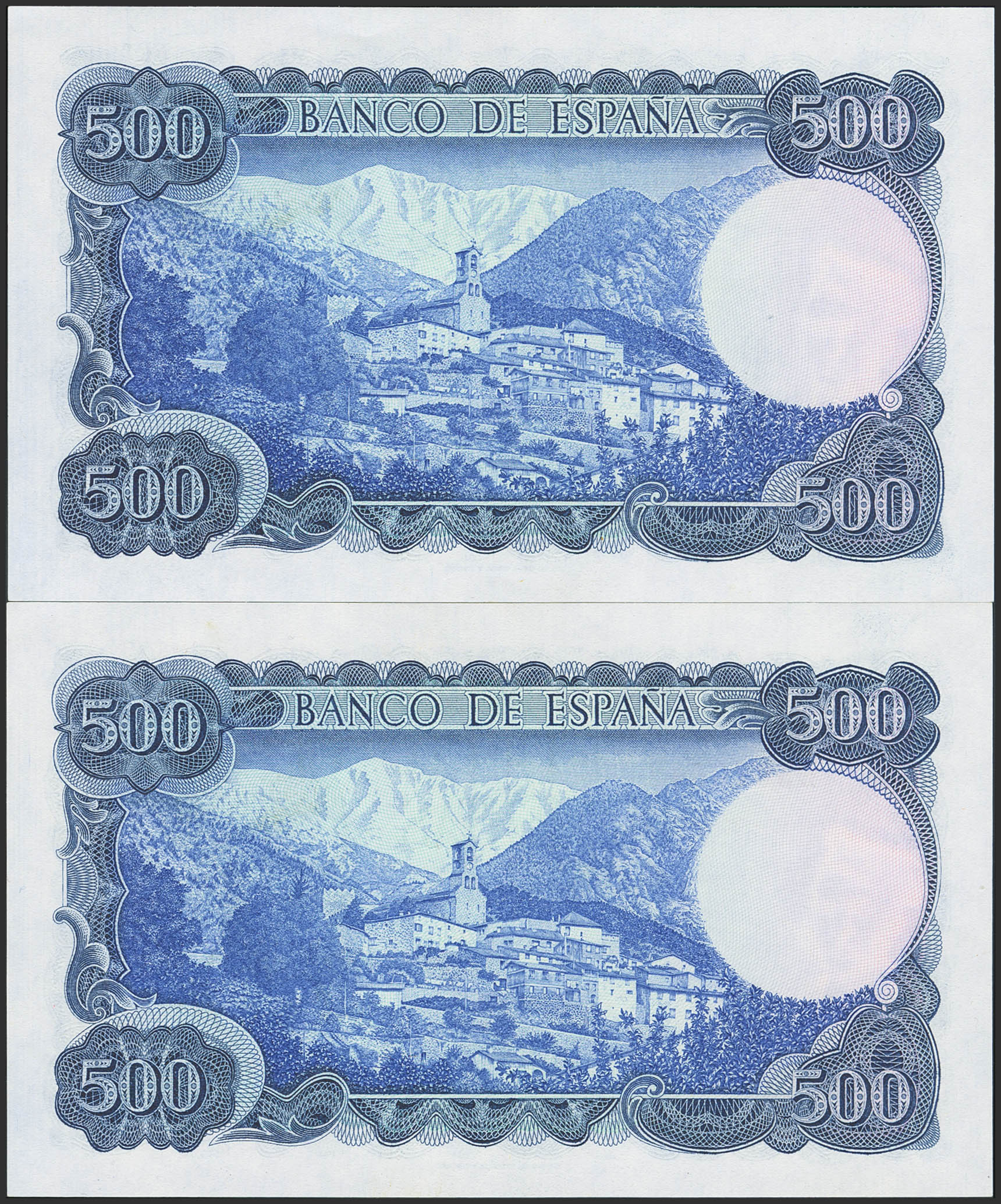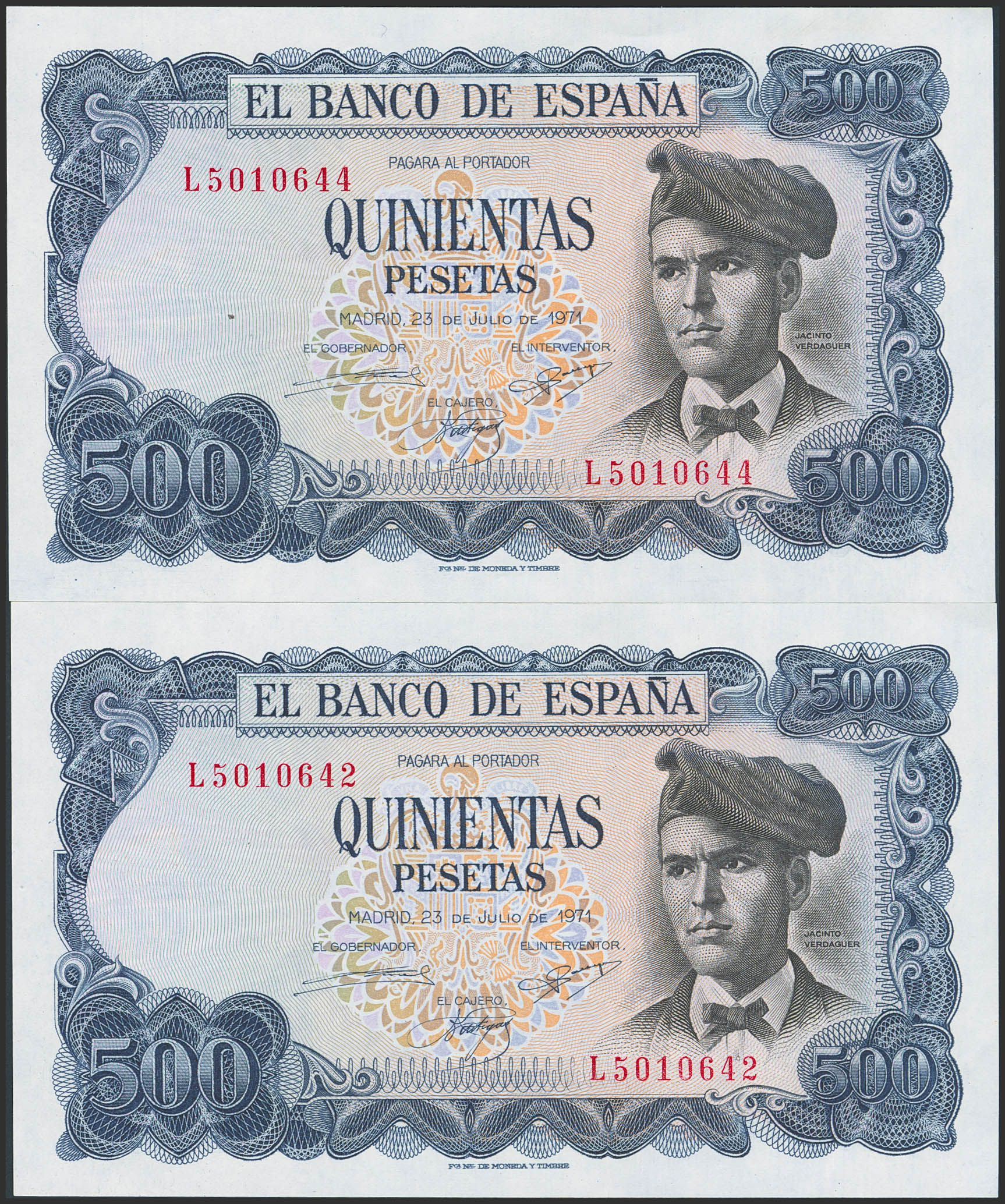 500 Pesetas. 23 de Julio de 1971. Pareja casi correlativa. Serie L. (Edifil 2023: 473a). SC-.