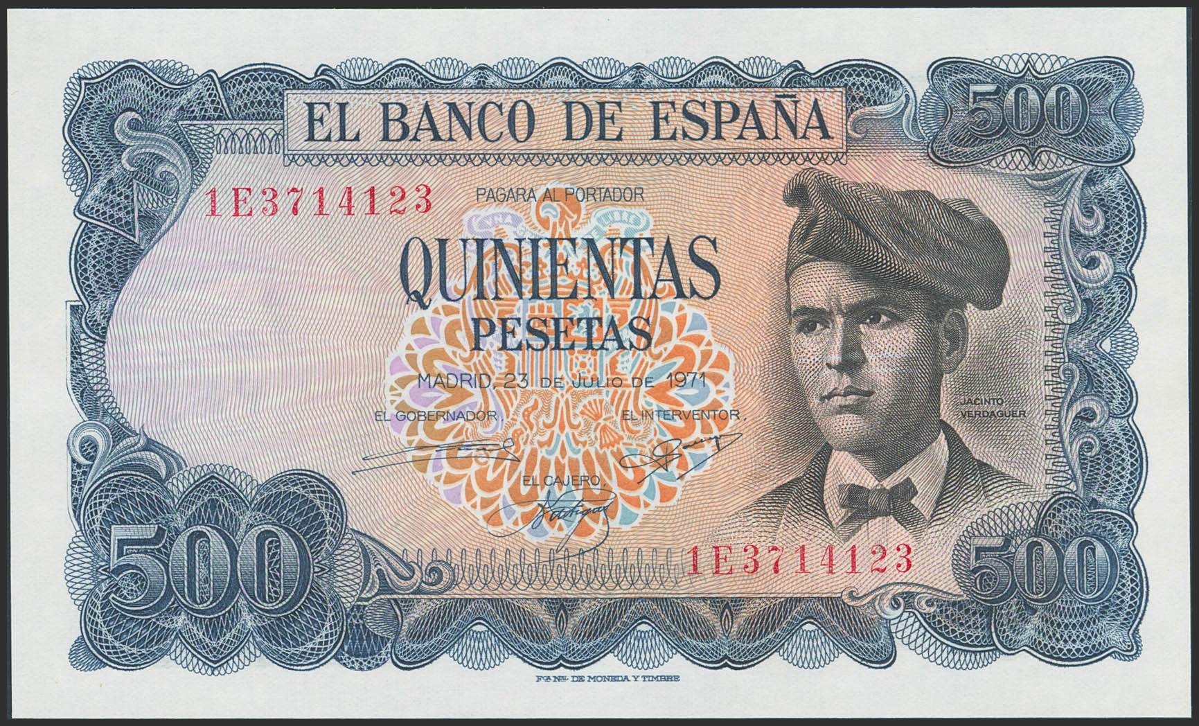 500 Pesetas. 23 de Julio de 1971. Serie 1E. (Edifil 2023: 473a). Apresto original. SC.