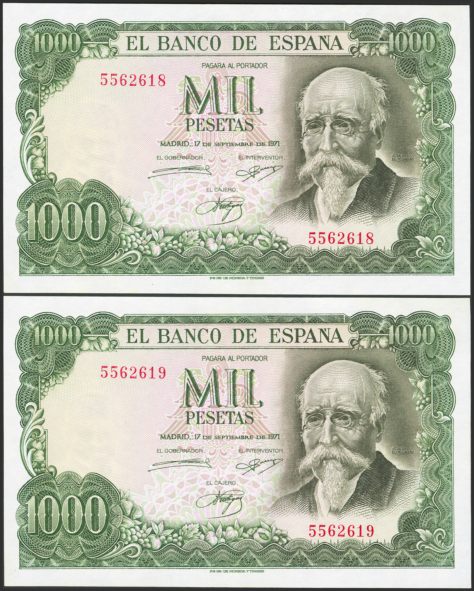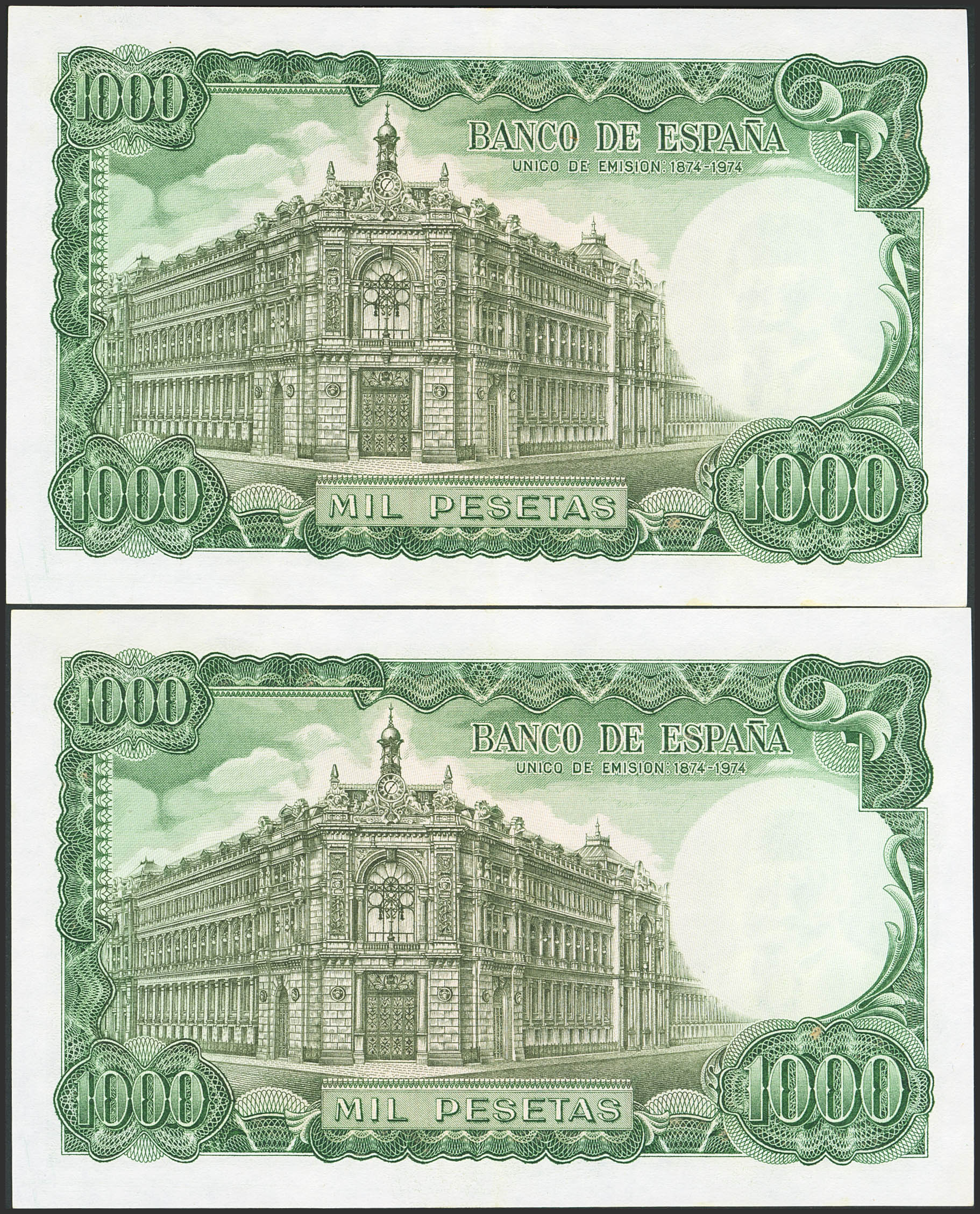 1000 Pesetas. 17 de Septiembre de 1971. Pareja correlativa. Sin serie. (Edifil 2023: 474). Conserva parte de su apresto original. EBC+.