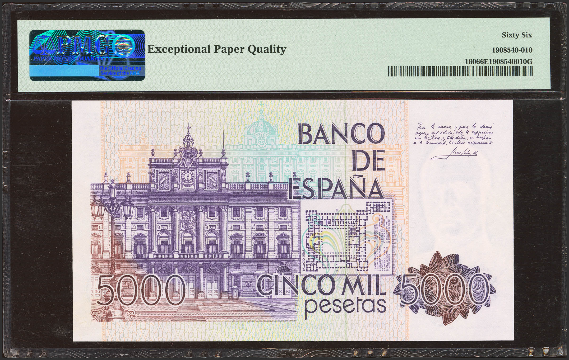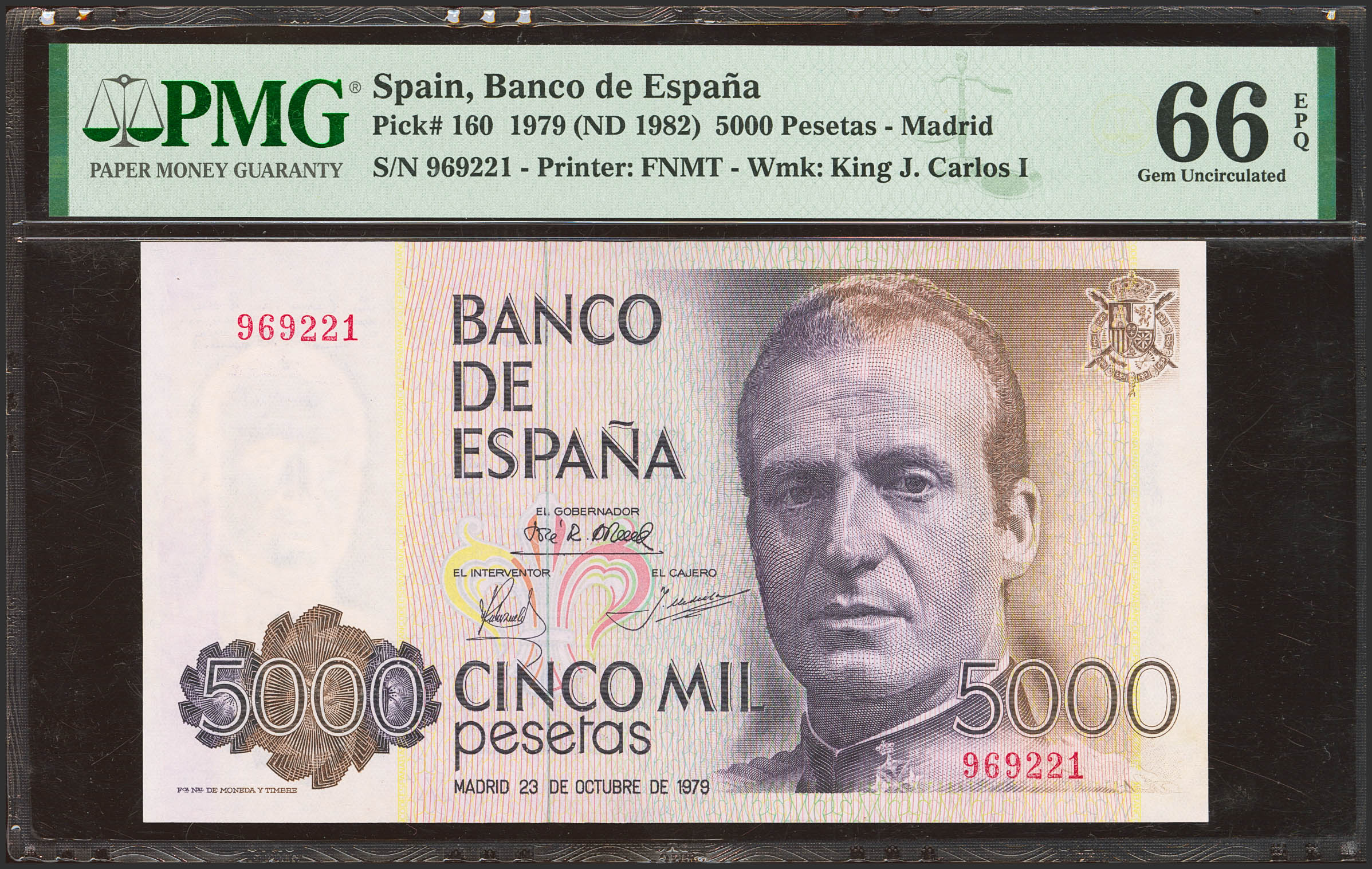 5000 Pesetas. 23 de Octubre de 1979. Sin serie. (Edifil 2023: 478, Pick: 160). Inusual en esta excepcional calidad, apresto original. SC. Encapsulado PMG66EPQ.