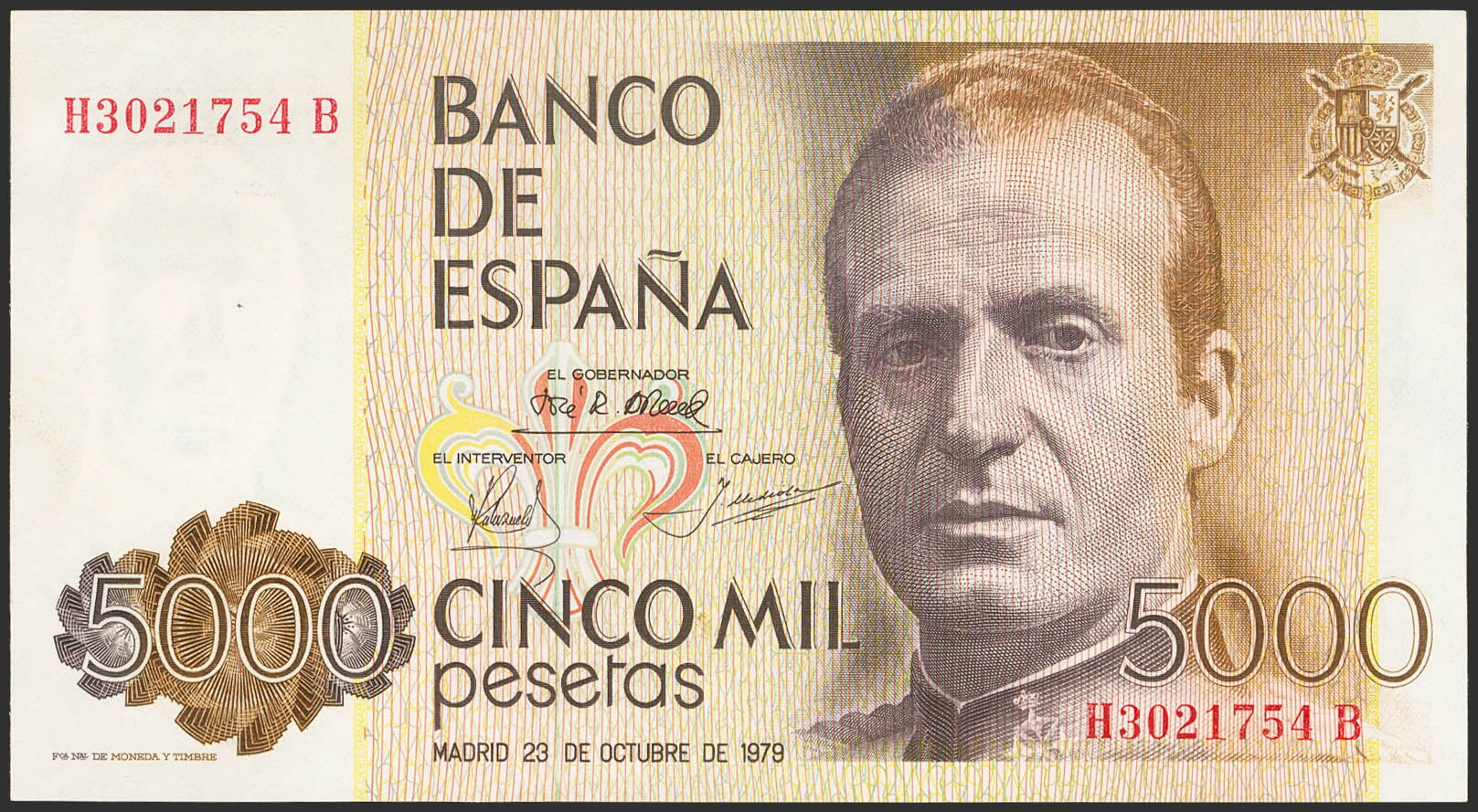 5000 Pesetas. 23 de Octubre de 1979. Serie H-B. (Edifil 2023: 478a). SC-.