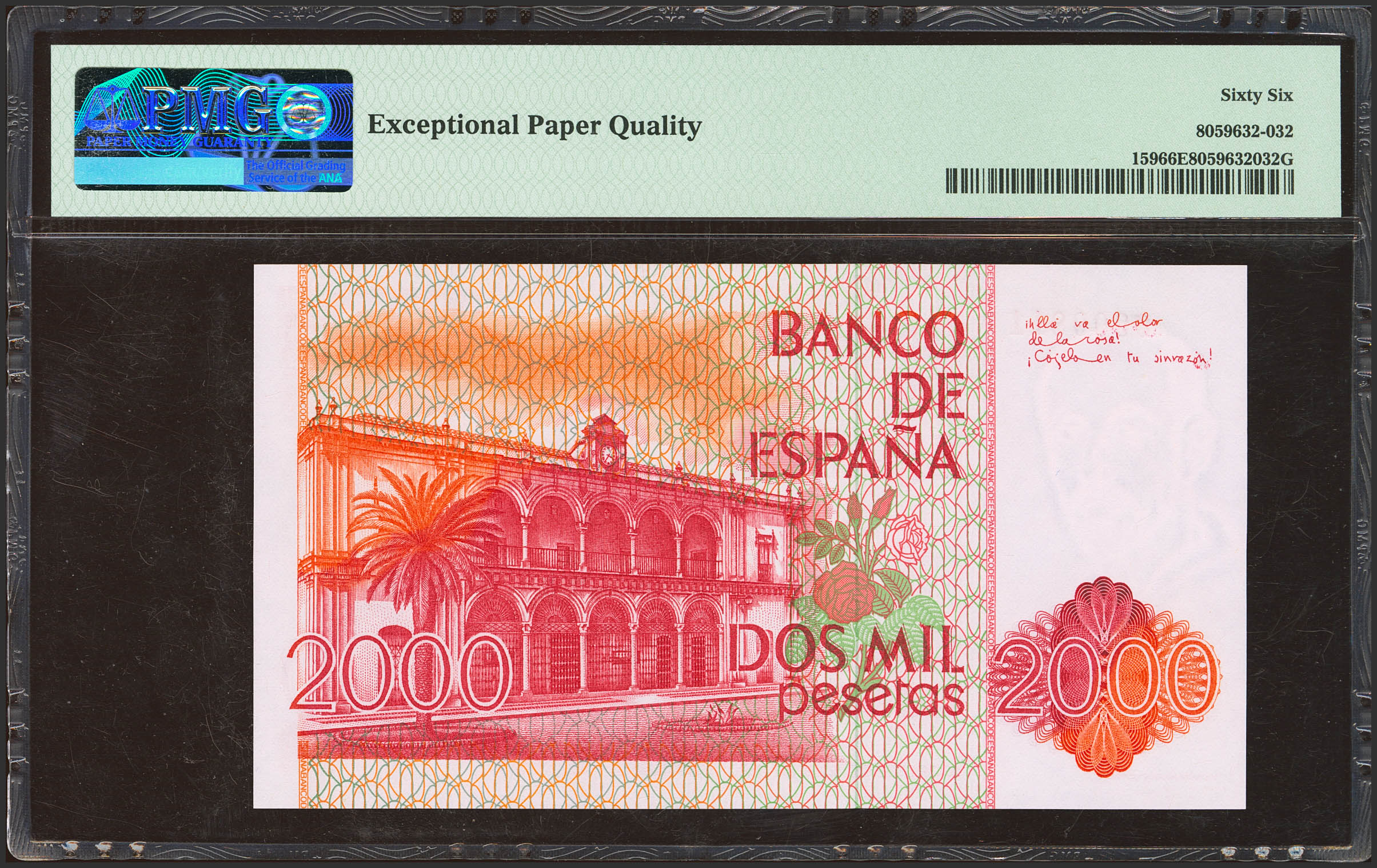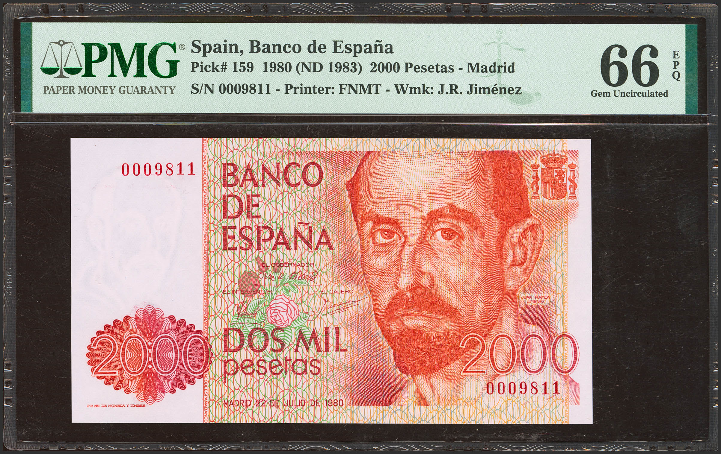 2000 Pesetas. 22 de Julio de 1980. Sin serie y numeración bajísima. (Edifil 2023: 479, Pick: 159). SC. Encapsulado PMG66EPQ.