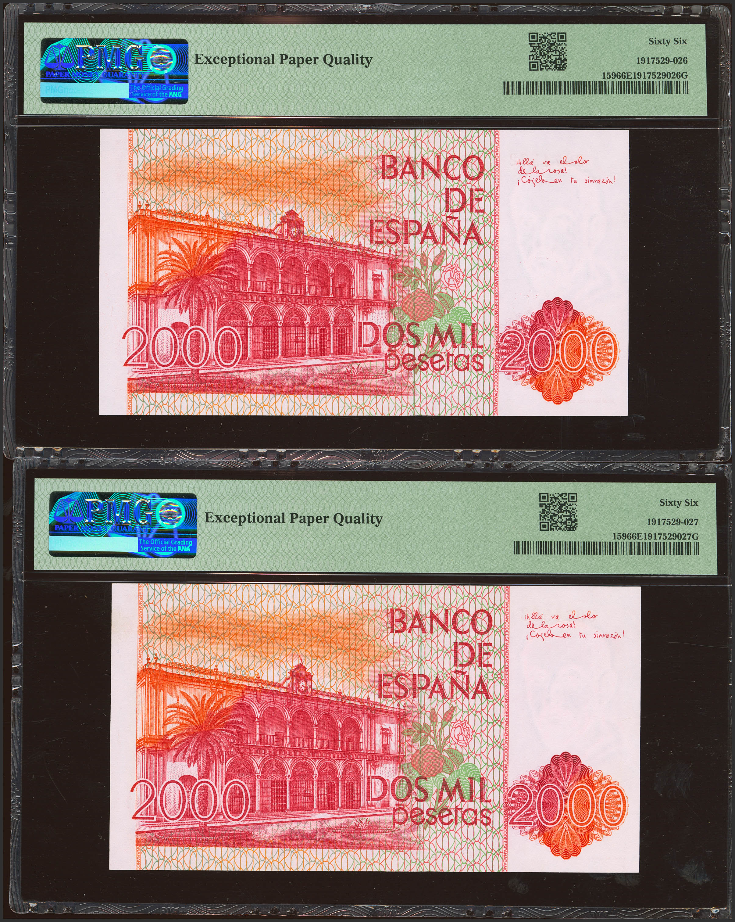 2000 Pesetas. 22 de Julio de 1980. Pareja correlativa. Sin serie y numeracion baja. (Edifil 2023: 479, Pick: 159). Inusual en esta excepcional calidad. SC. Encapsulados PMG66EPQ, ambos.