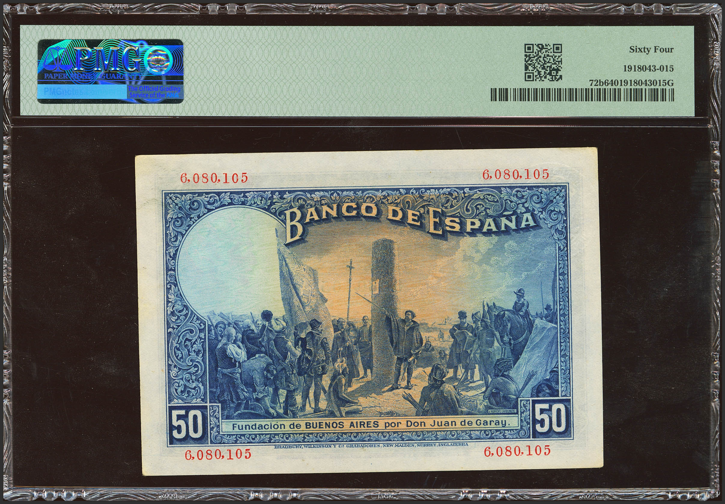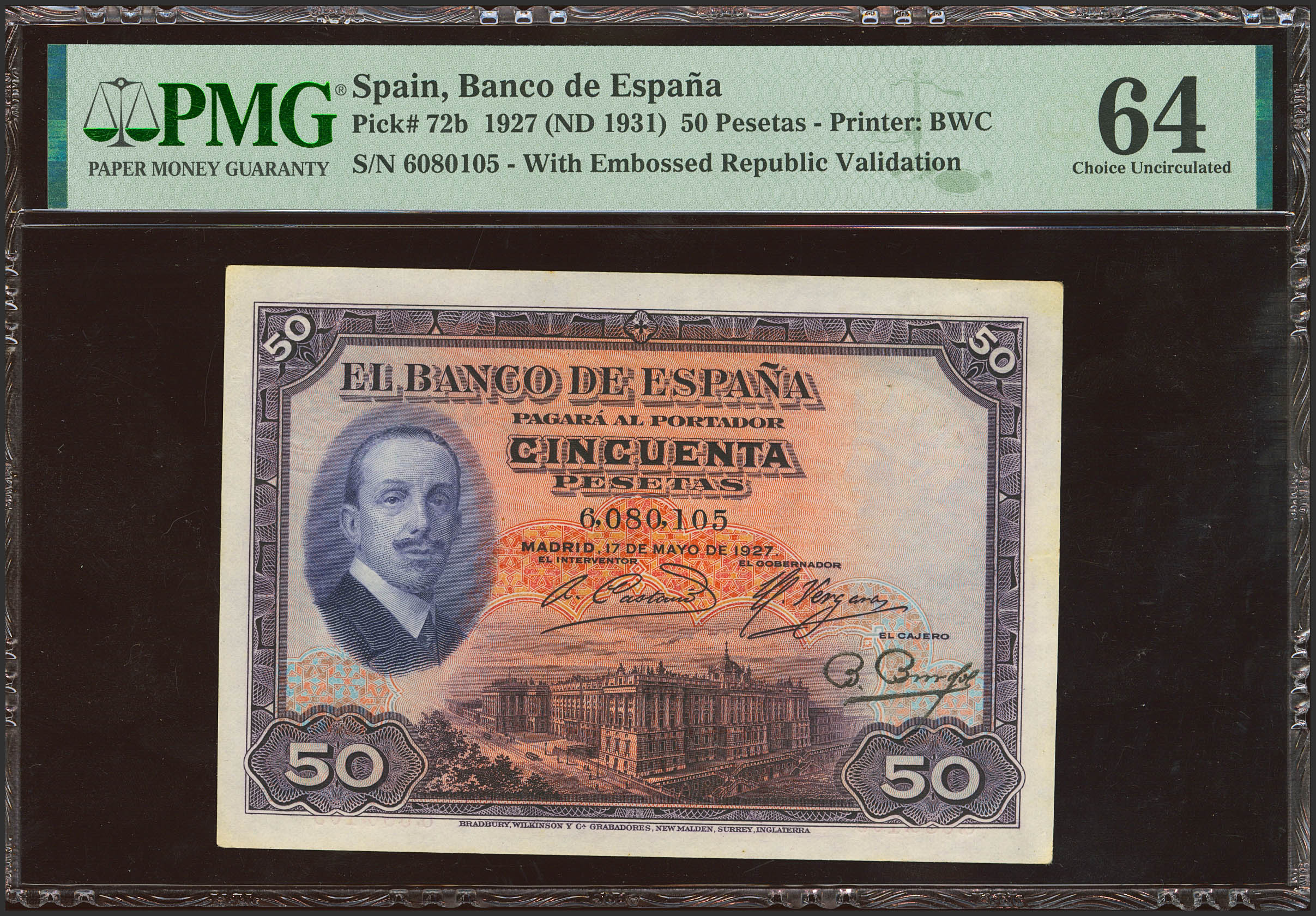 50 Pesetas. 17 de Mayo de 1927. Sin serie y sello en seco "Gobierno Provisional de la República / 14 Abril 1931". (Edifil 2023: 339, Pick: 72b). Extremadamente raro especialmente en esta excepcional calidad. SC. Encapsulado PMG64.