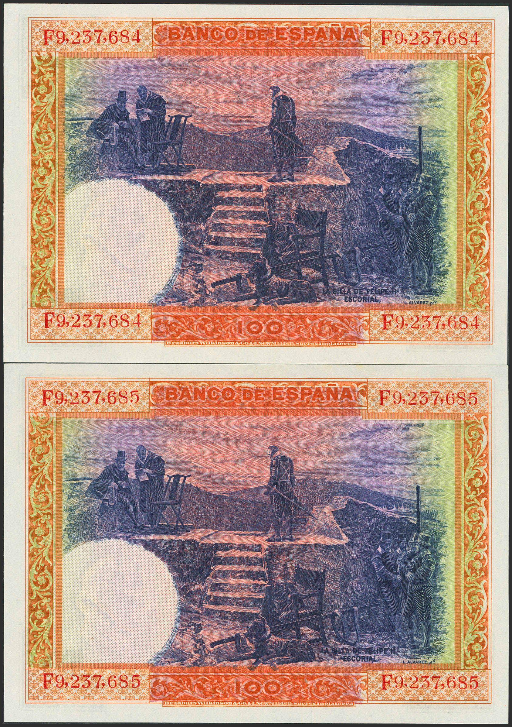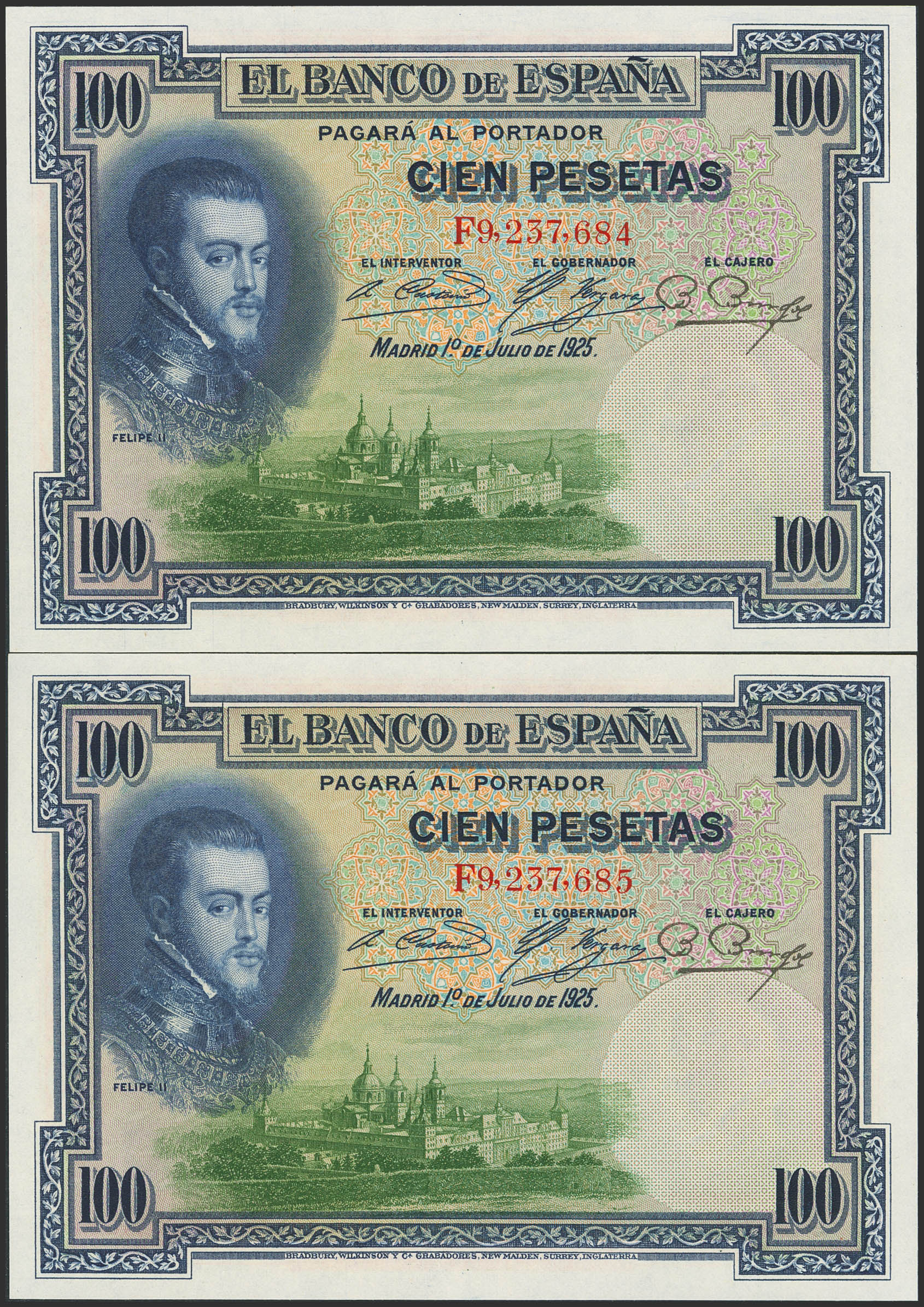 100 Pesetas. 1 de Julio de 1925. Pareja correlativa. Serie F. (Edifil 2023: 350). Conserva todo su apresto original. SC.