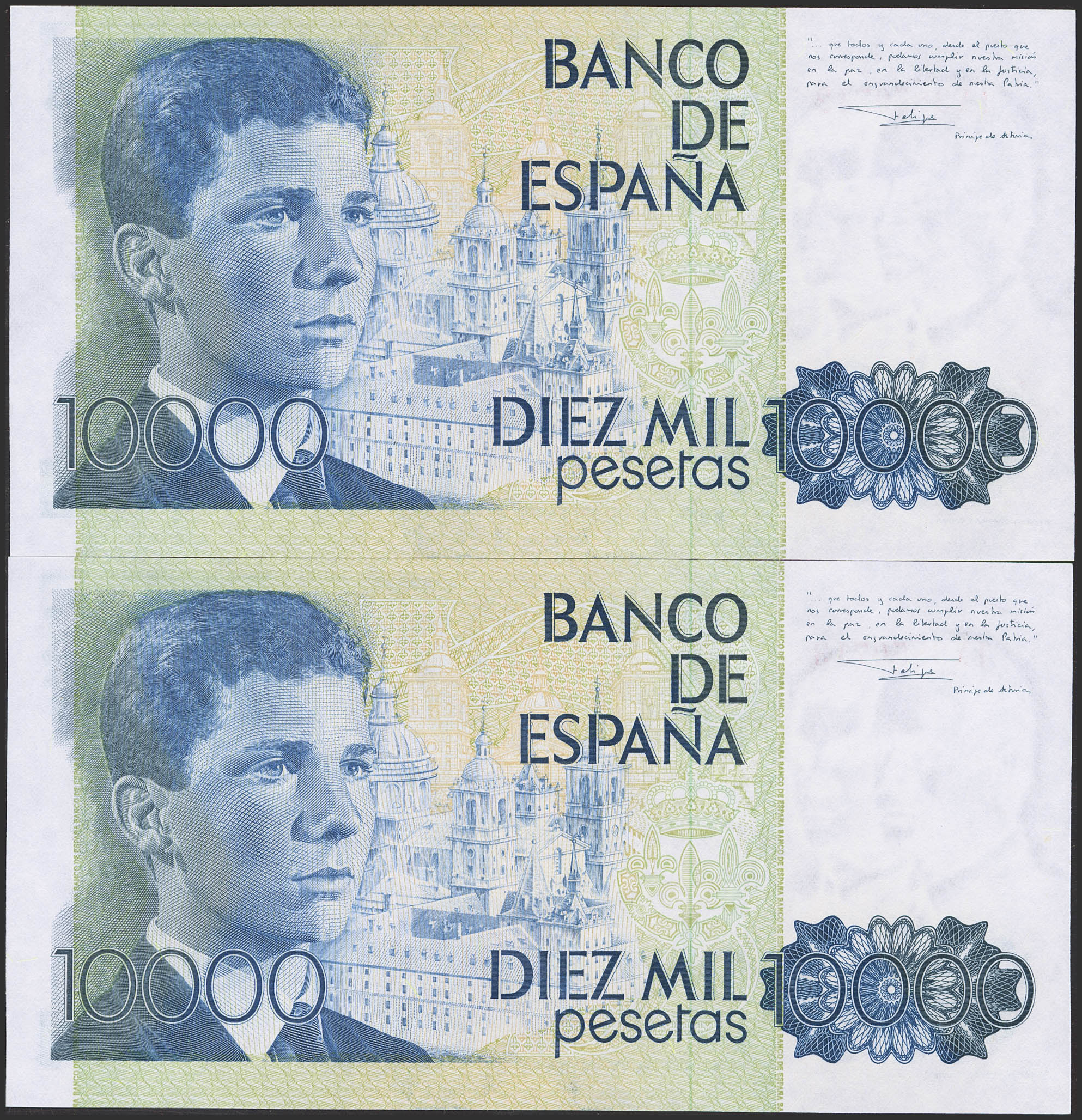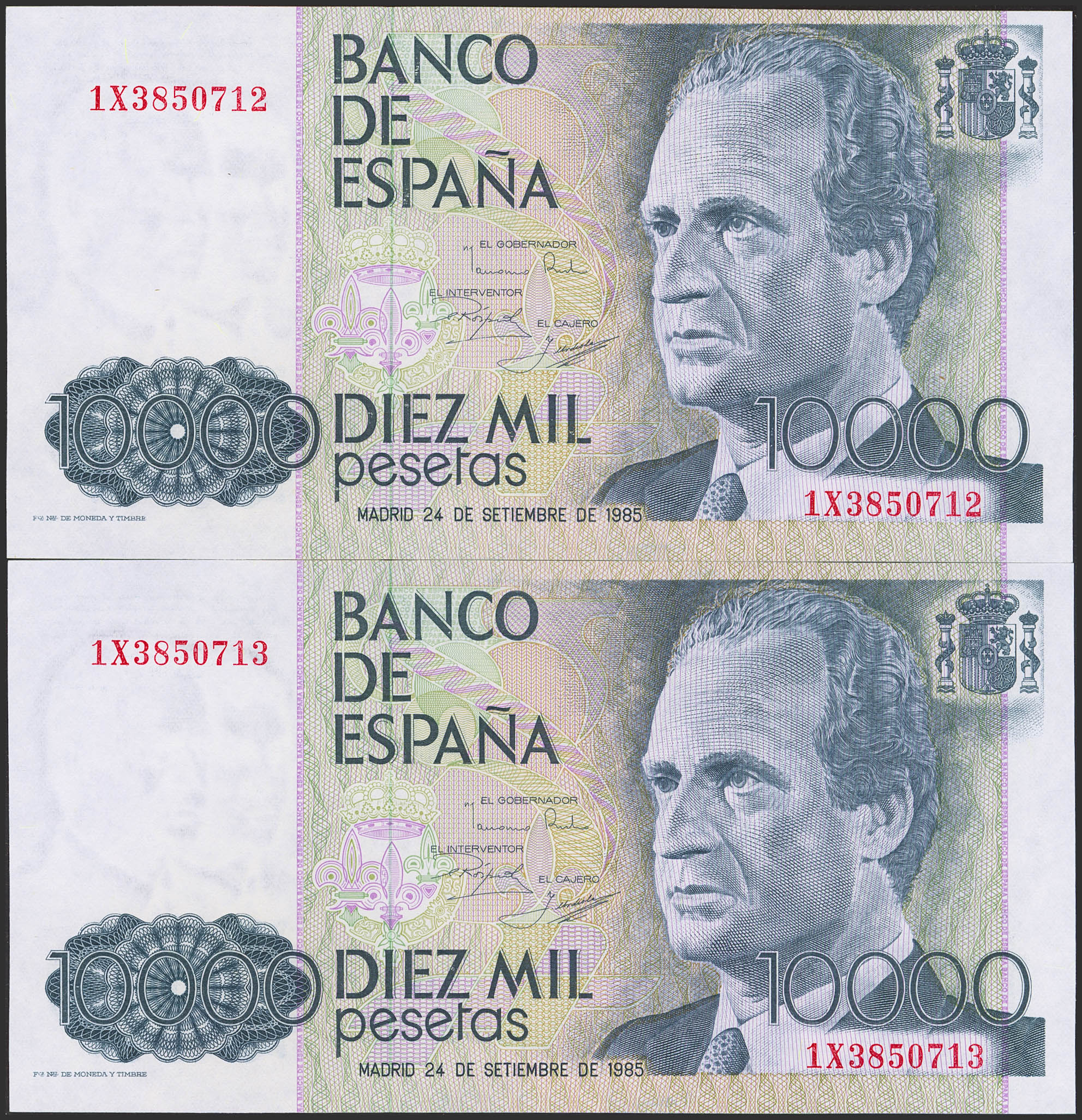 10000 Pesetas. 24 de Septiembre de 1985. Pareja correlativa. Serie 1X. (Edifil 2023: 481a). SC.