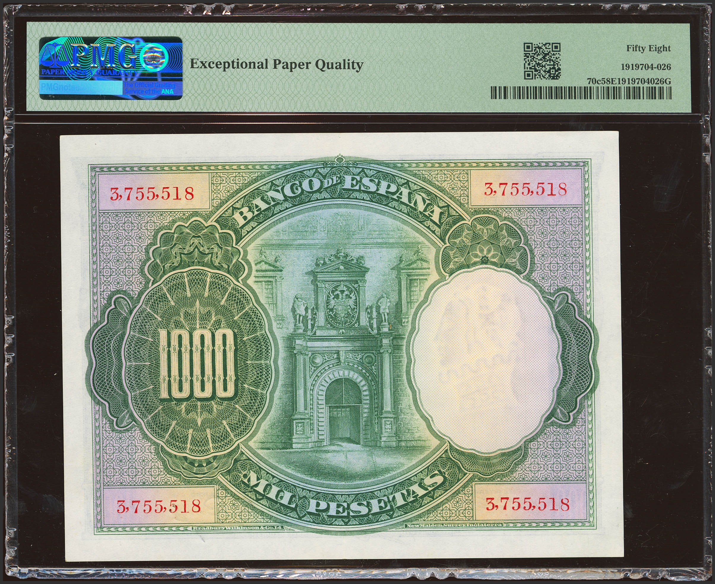 1000 Pesetas. 1 de Julio de 1925. Sin serie y numeración superior al 3646000. (Edifil 2023: 351, Pick: 70c). Inusual en esta calidad, apresto original. EBC+++. Encapsulado PMG58EPQ.
