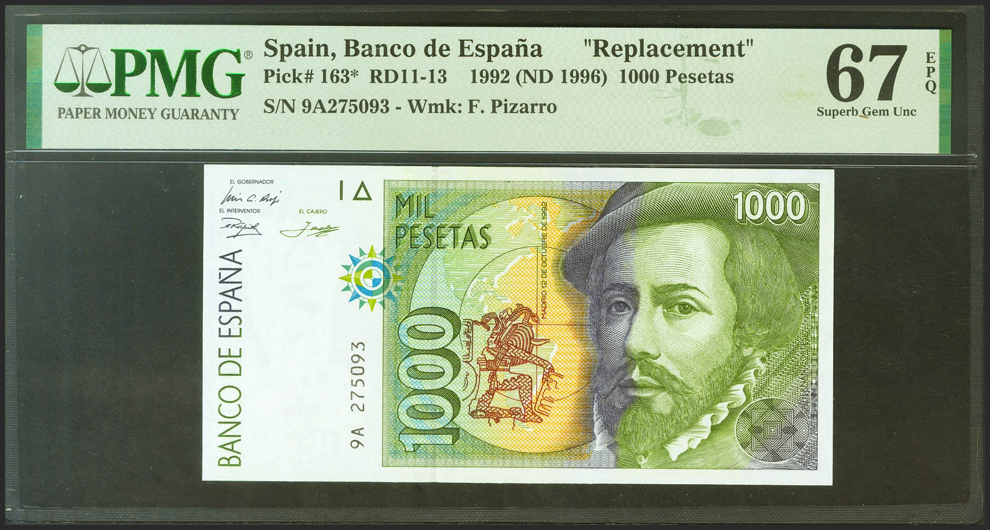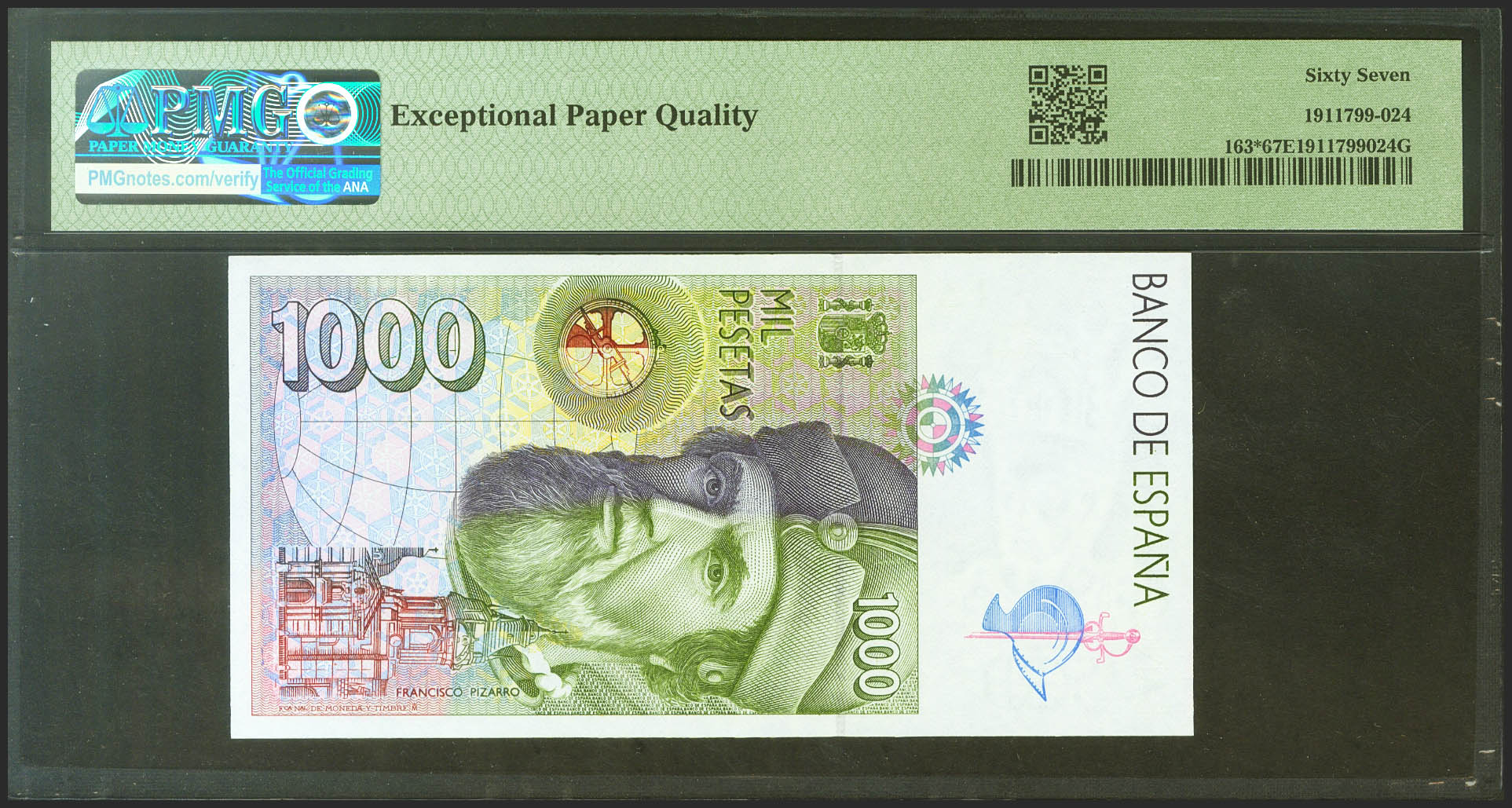 1000 Pesetas. 12 de Octubre de 1992. Serie especial 9A. (Edifil 2021: 483c, Pick: 163*). Extraordinariamente raro en esta excepcional calidad, apresto original. SC. Encapsulado PMG67EPQ.