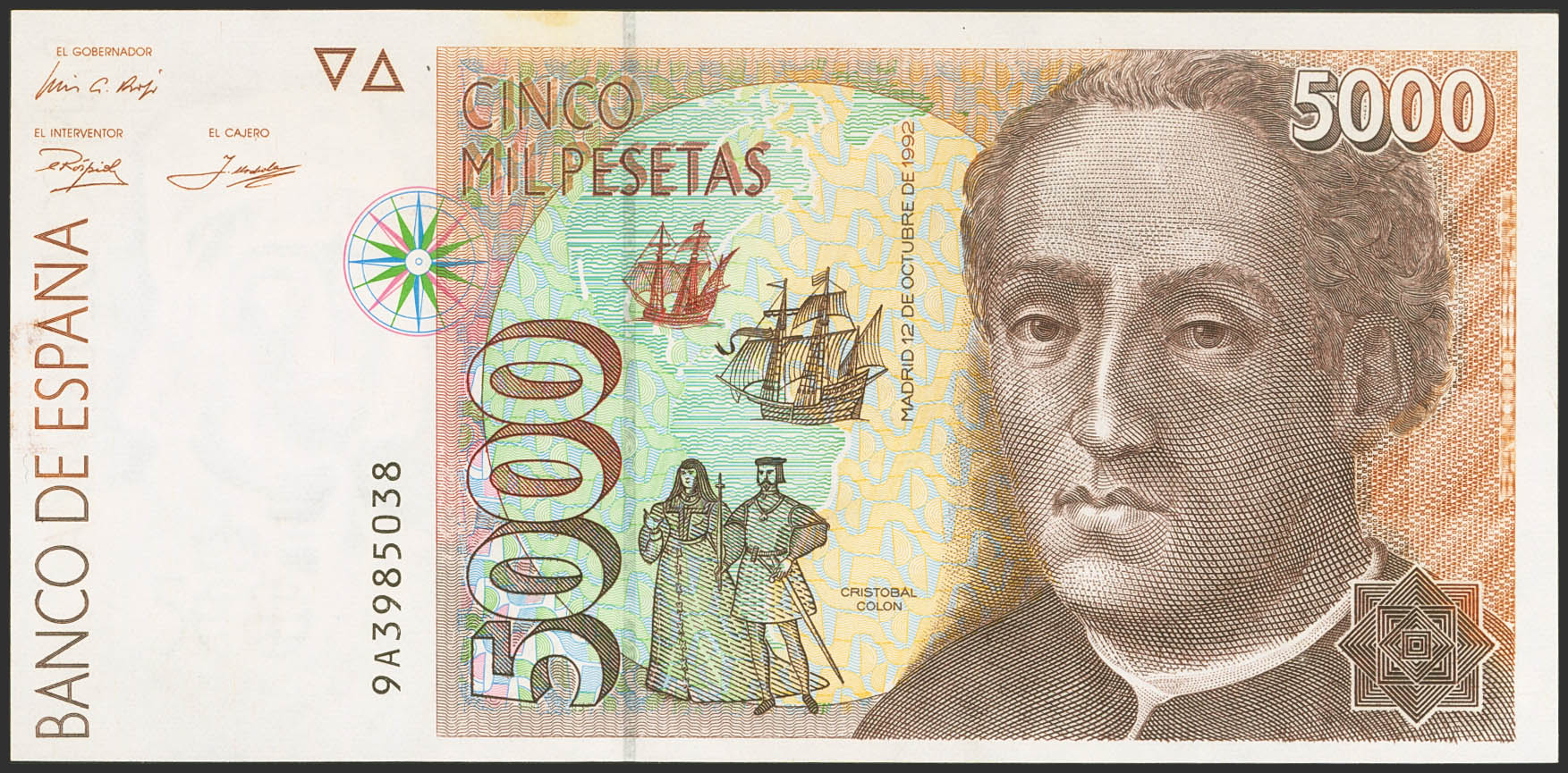5000 Pesetas. 12 de Octubre de 1992. Serie especial 9A. (Edifil 2021: 484b). Manchita del tiempo. EBC+.
