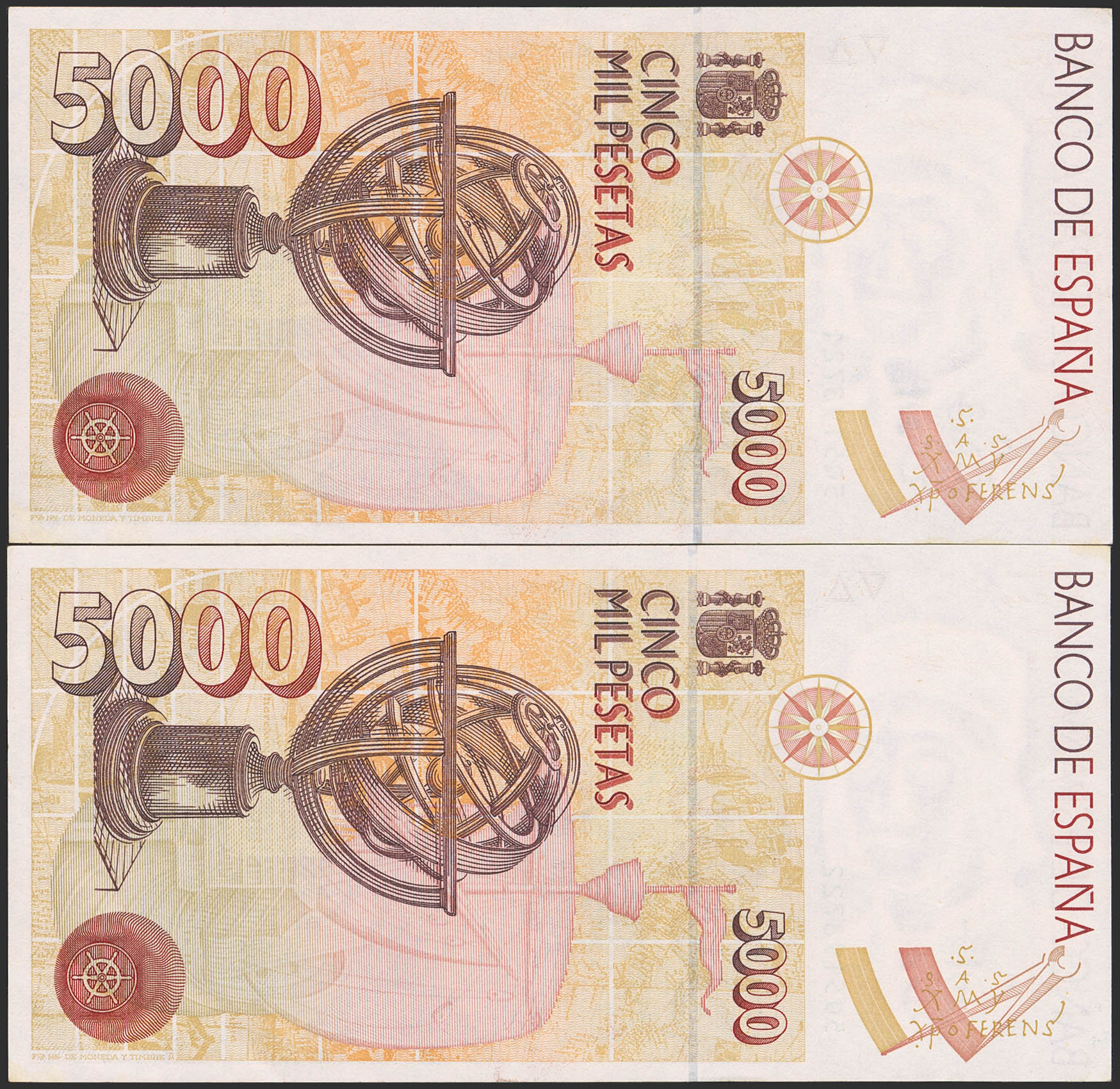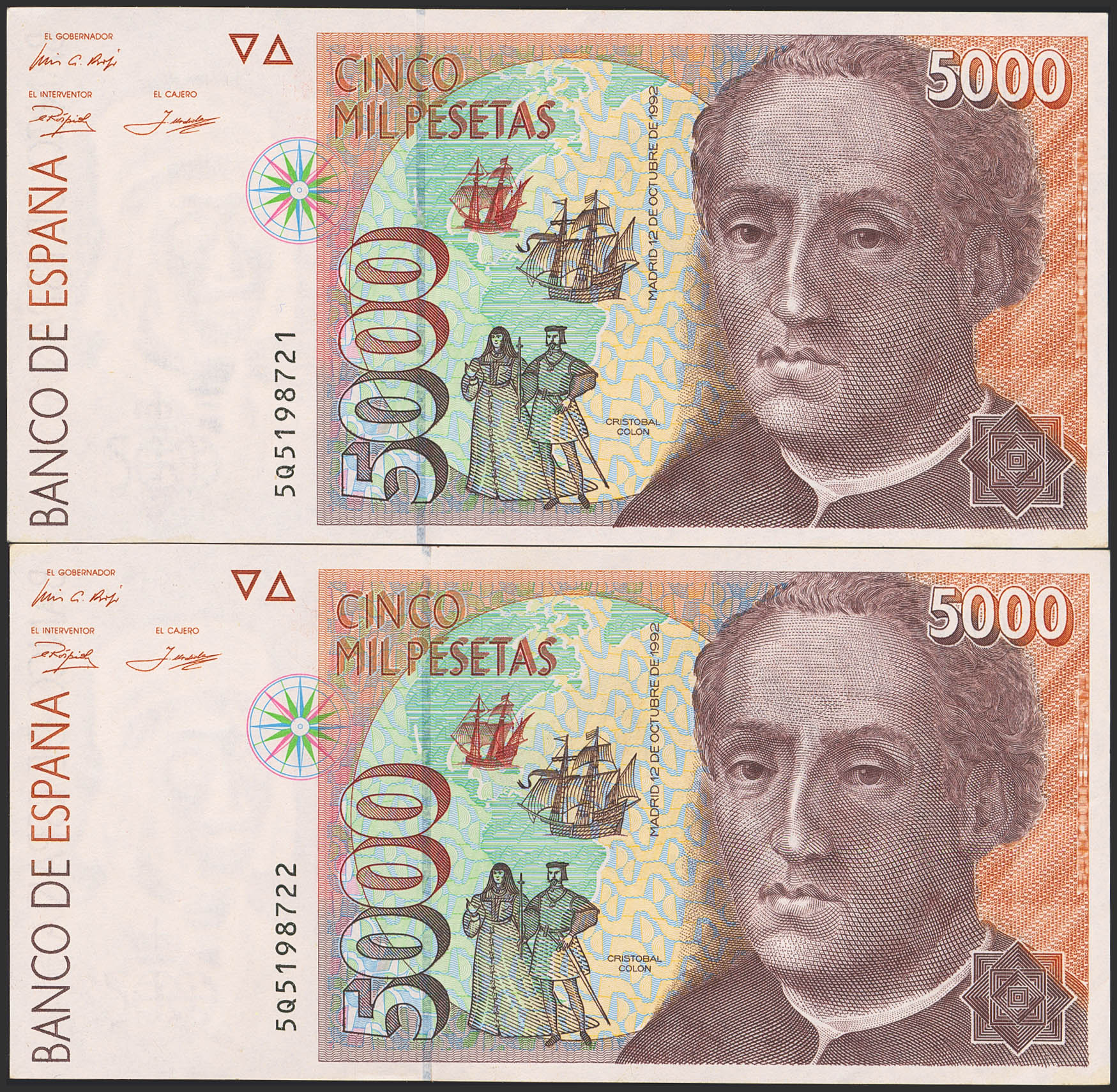 5000 Pesetas. 12 de Octubre de 1992. Pareja correlativa. Serie 5Q. (Edifil 2023: 484a). Sombritas del tiempo. SC-.