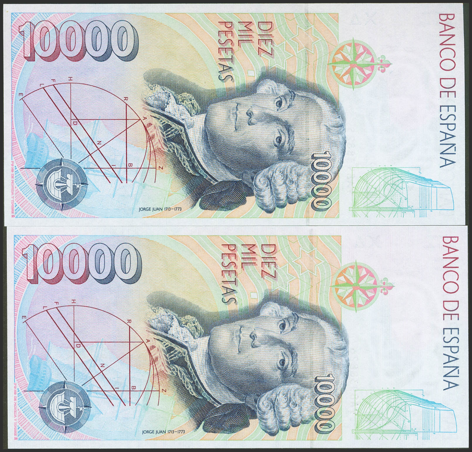 10000 Pesetas. 12 de Octubre de 1992. Pareja correlativa. Serie especial 9A. (Edifil 2021: 485b). Ondulación natural del proceso de fabricación (este es el único motivo de "quitarle" el SC). EBC+.