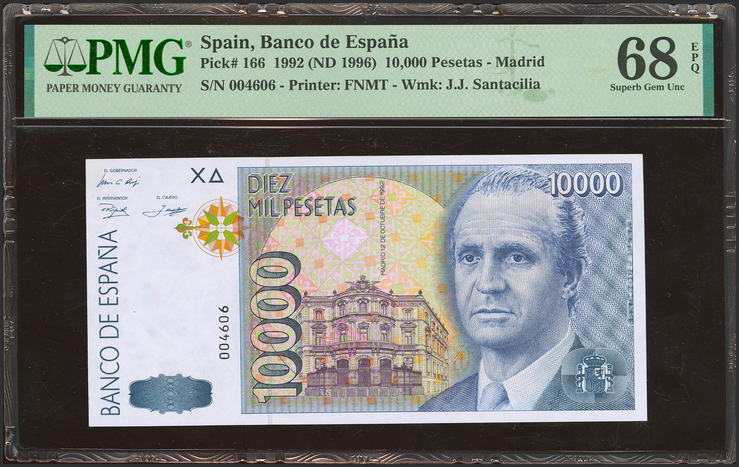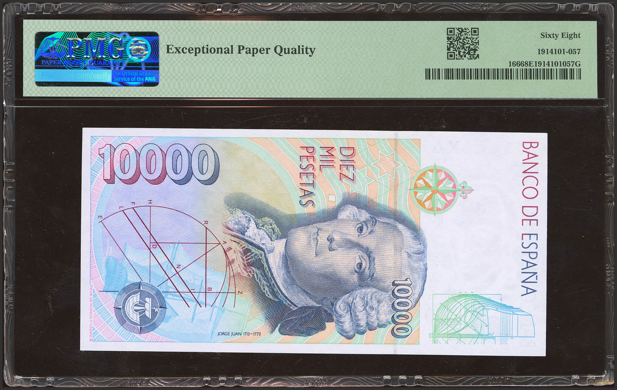 10000 Pesetas. 12 de Octubre de 1992. Sin serie. (Edifil 2023: 485, Pick: 166). Raro en esta excepcional calidad, apresto original. SC. Encapsulado PMG68EPQ.