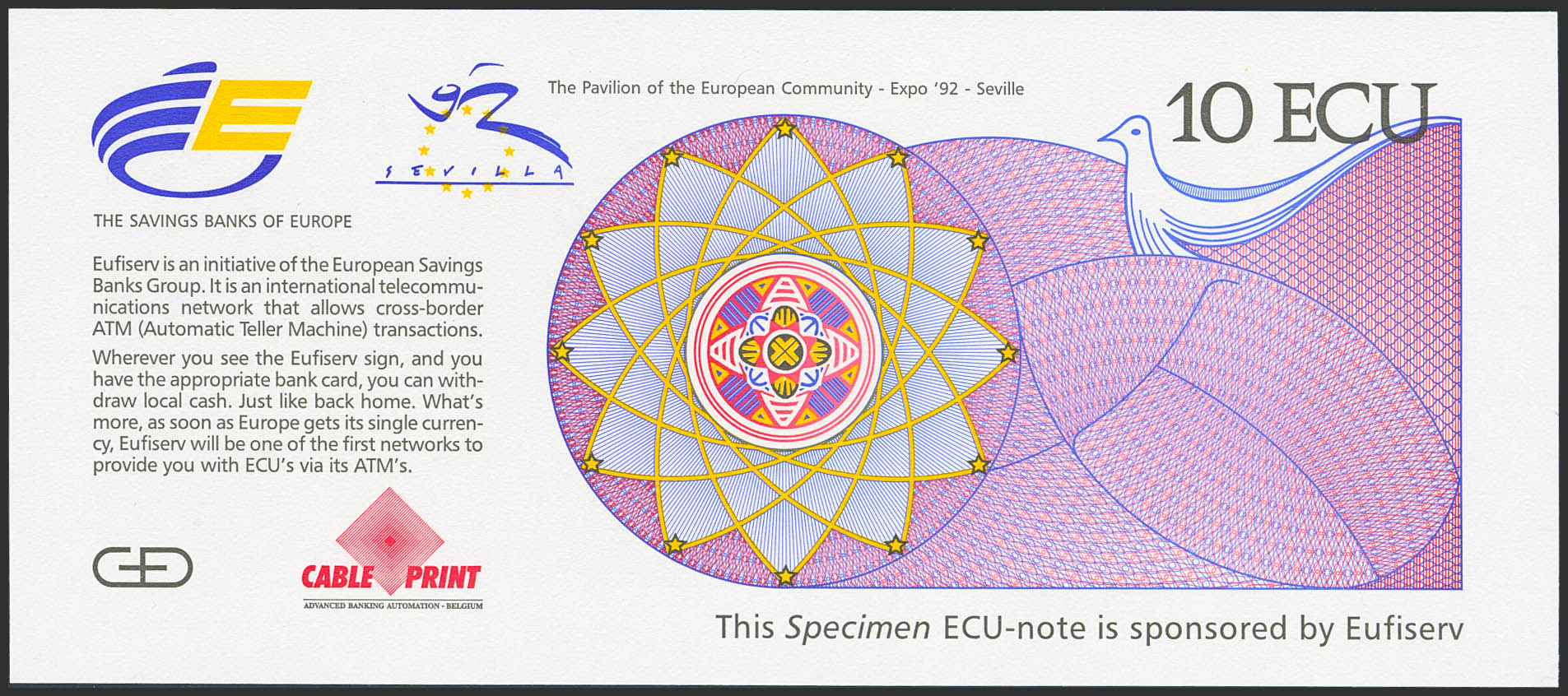 10 Ecu. 1992. SPECIMEN. Billete Promocional de la moneda única Europea, el Ecu, expuesta en el pabellón de la Comunidad Europea con motivo de la Exposición Universal de Sevilla. Muy raro. SC-.