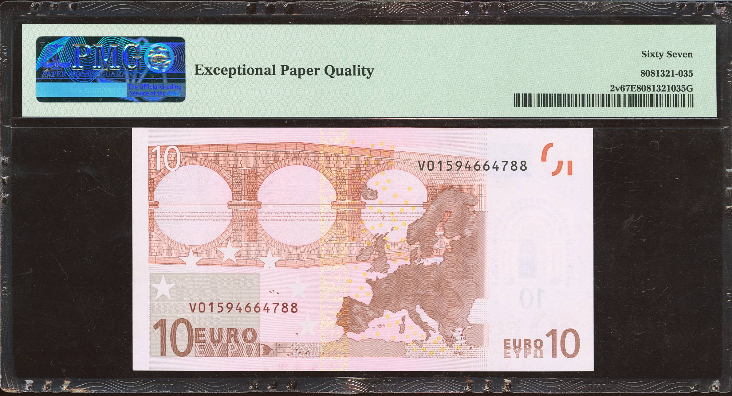 10 Euros. 1 de Enero de 2002. Firma Duisenberg. Serie V (España). (Edifil 2023: 487, Pick: 2v). SC. Encapsulado PMG67EPQ.