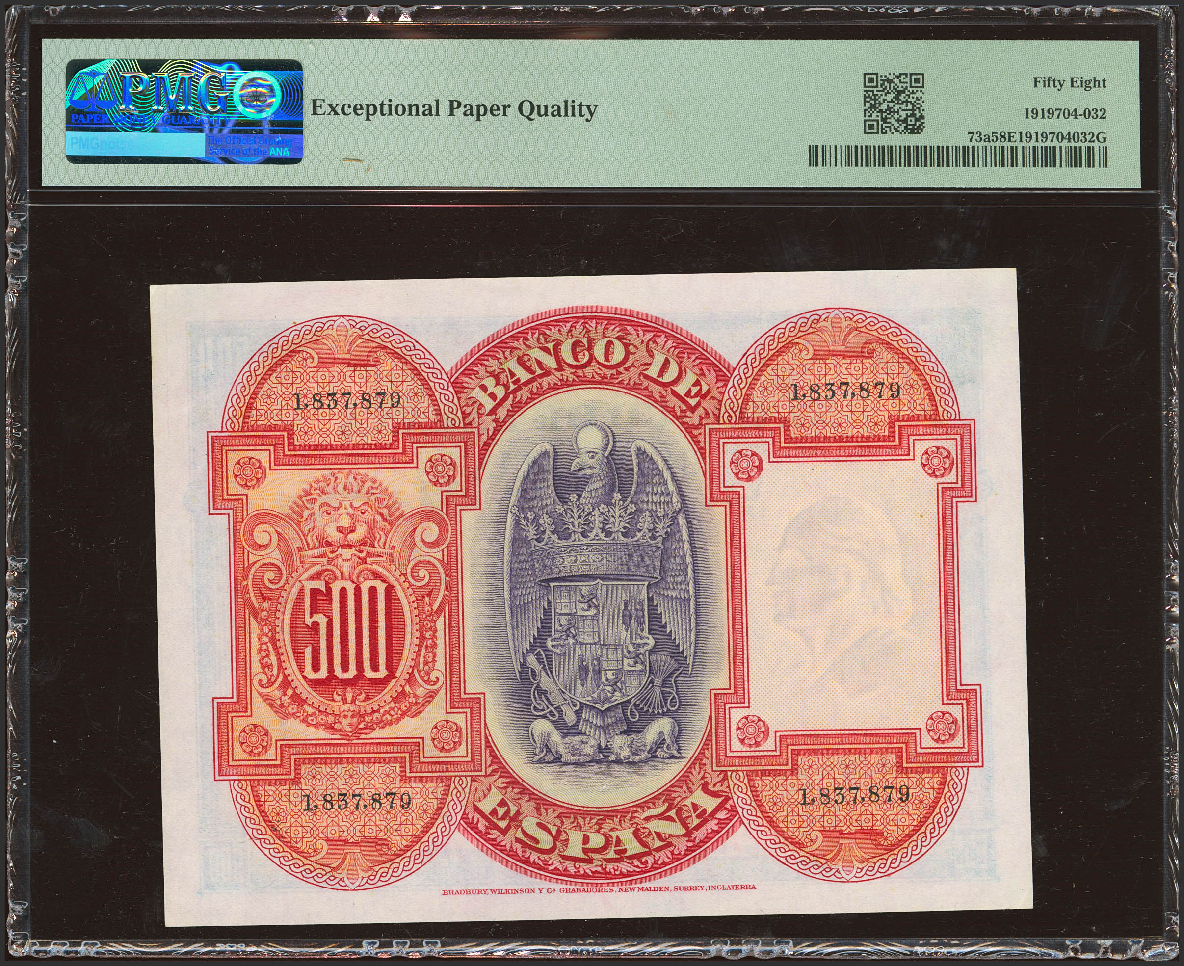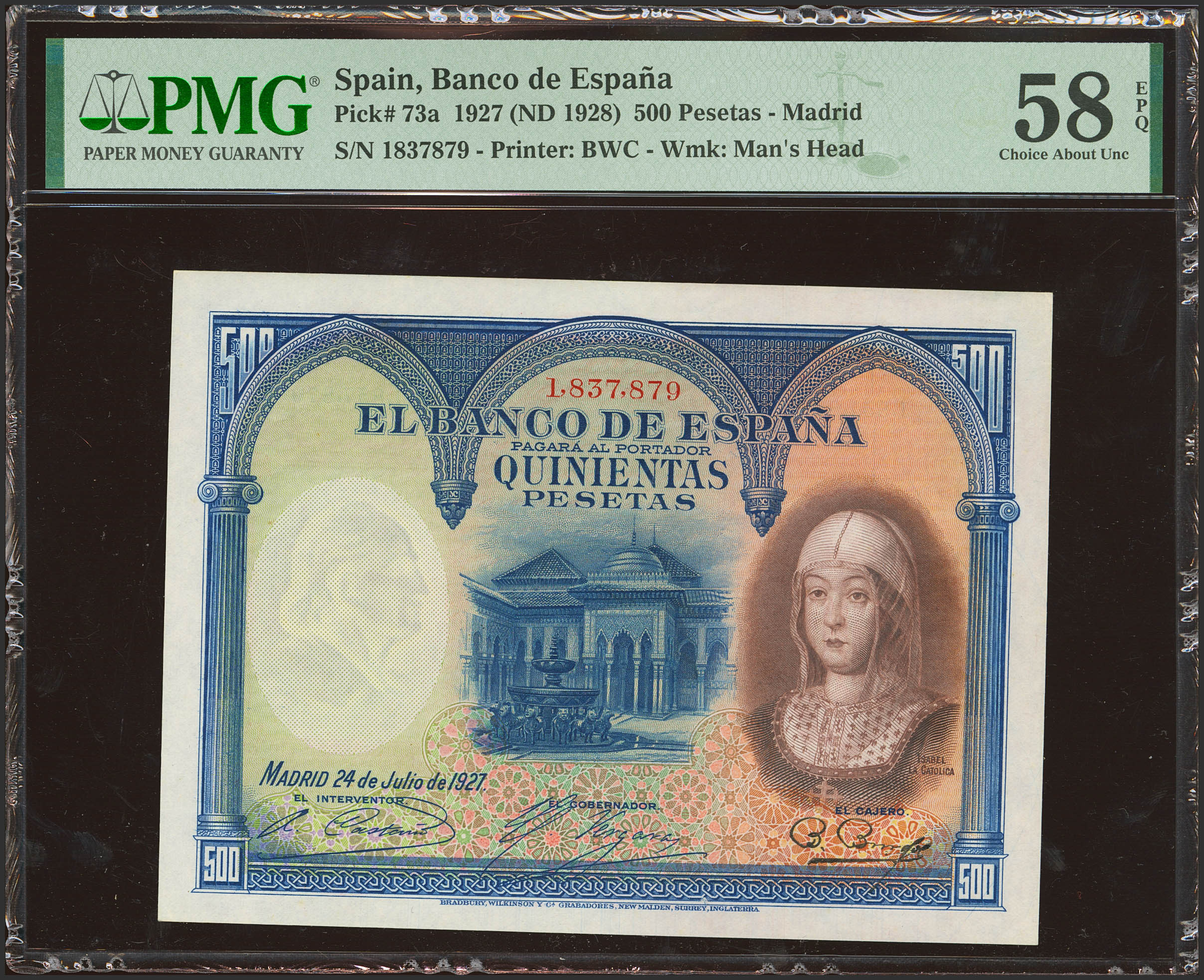 500 Pesetas. 24 de Julio de 1927. Sin serie y numeración posterior 1602000. (Edifil 2023: 352, Pick: 73c). Inusual en esta calidad, apresto original. EBC+++. Encapsulado PMG58EPQ.