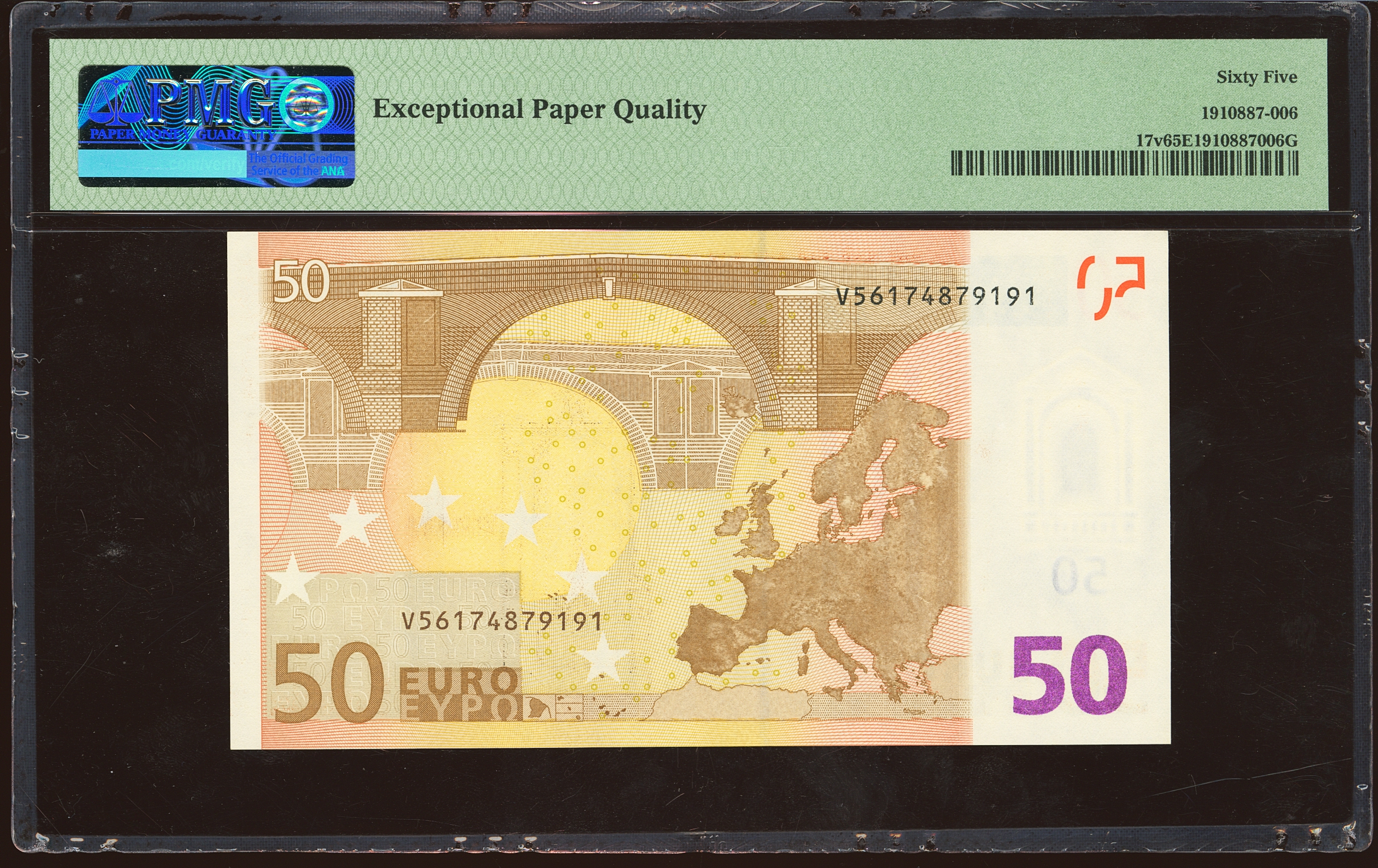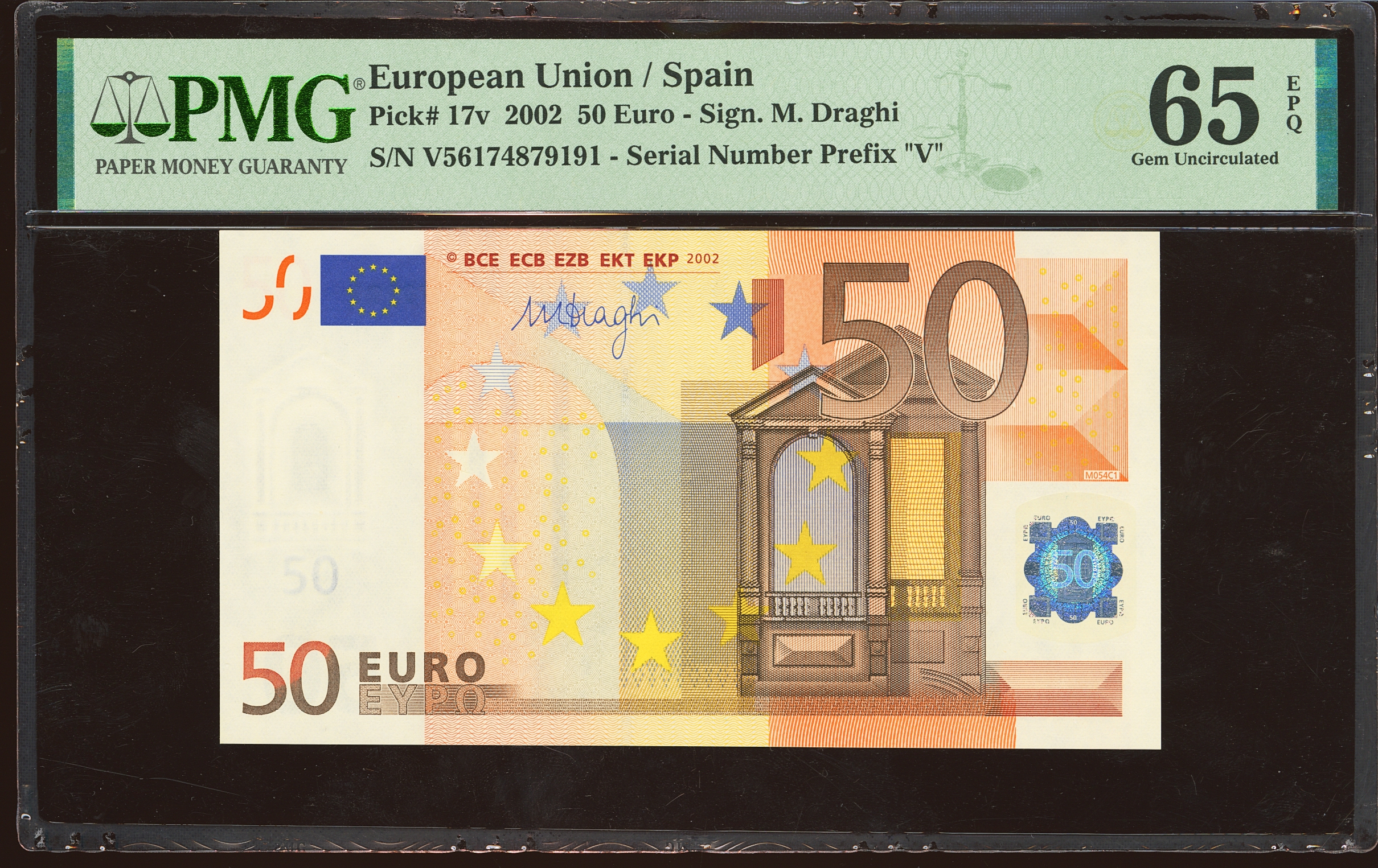 50 Euros. 1 de Enero de 2002. Firma Draghi. Serie V (España). (Edifil 2023: 489B, Pick: 17v). SC. Encapsulado PMG65EPQ.