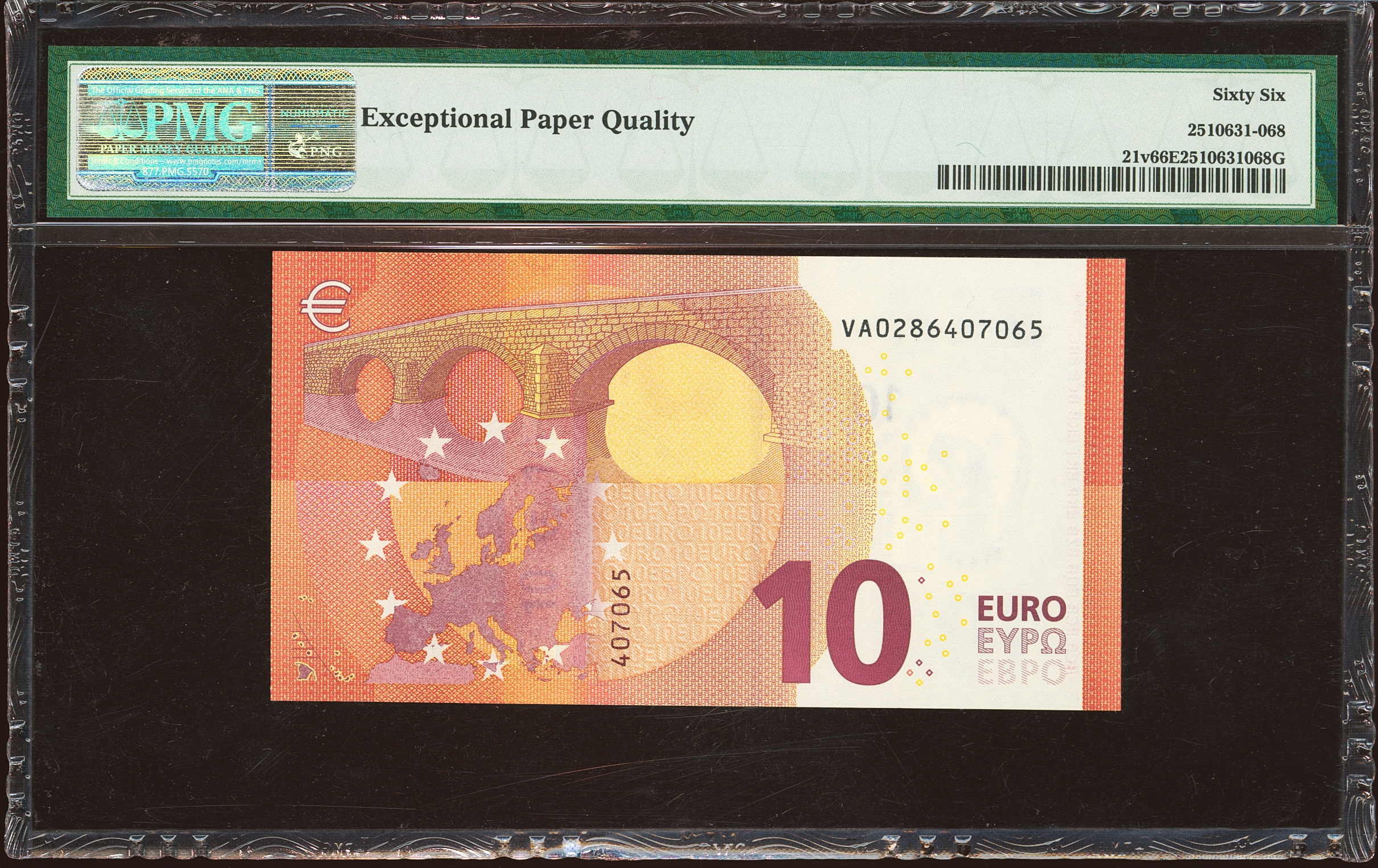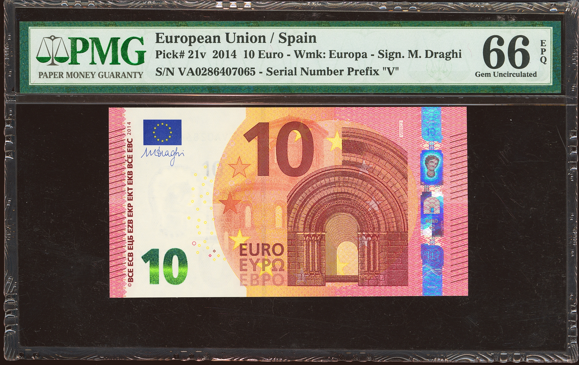 10 Euros. 23 de Septiembre de 2014. Firma Draghi. Serie V (España). (Edifil 2023: 494, Pick: 21v). Apresto original. SC. Encapsulado PMG66EPQ.