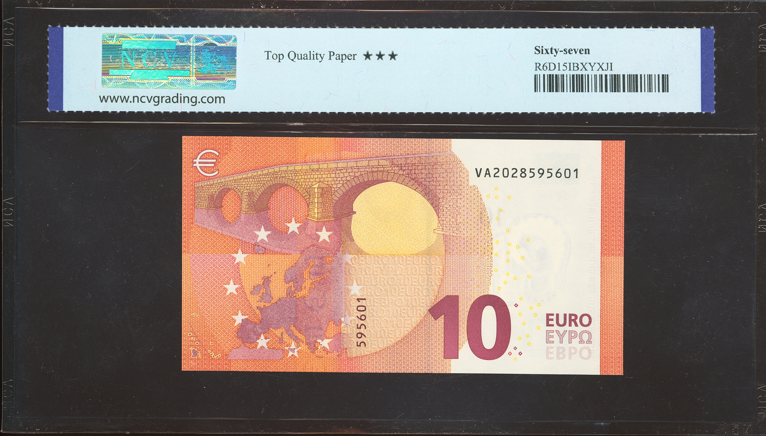 10 Euros. 23 de Septiembre de 2014. Firma Draghi. Serie V (España). (Edifil 2023: 494, Pick: 21v). Apresto original. SC. Encapsulado NCV67TQP.
