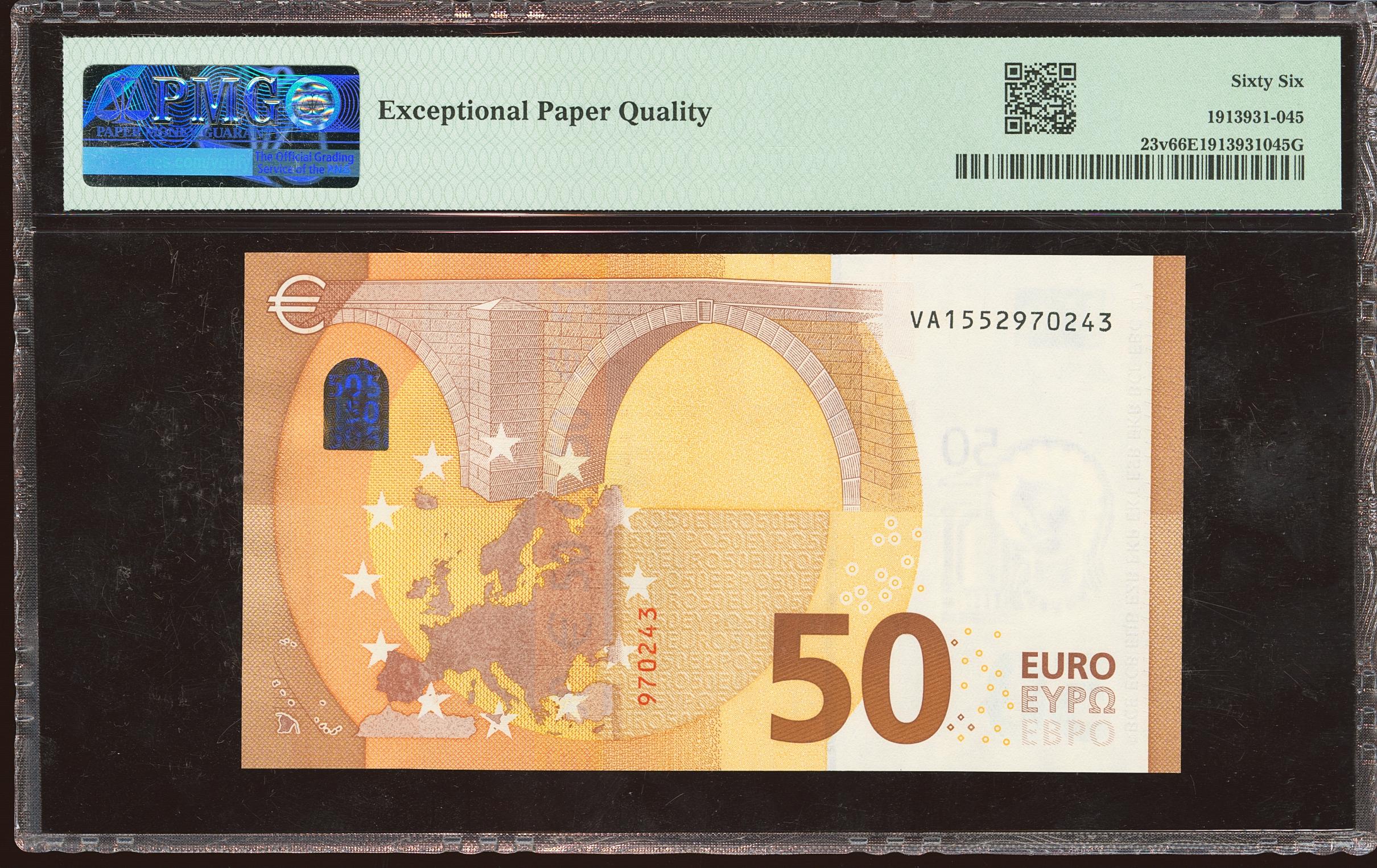 50 Euros. 4 de Abril de 2017. Firma Draghi. Serie V (España). (Edifil 2021: 496, Pick: 23v). SC. Encapsulado PMG66EPQ.