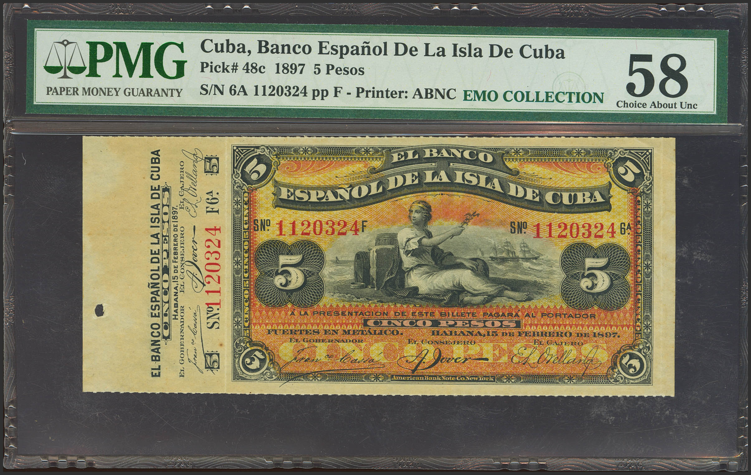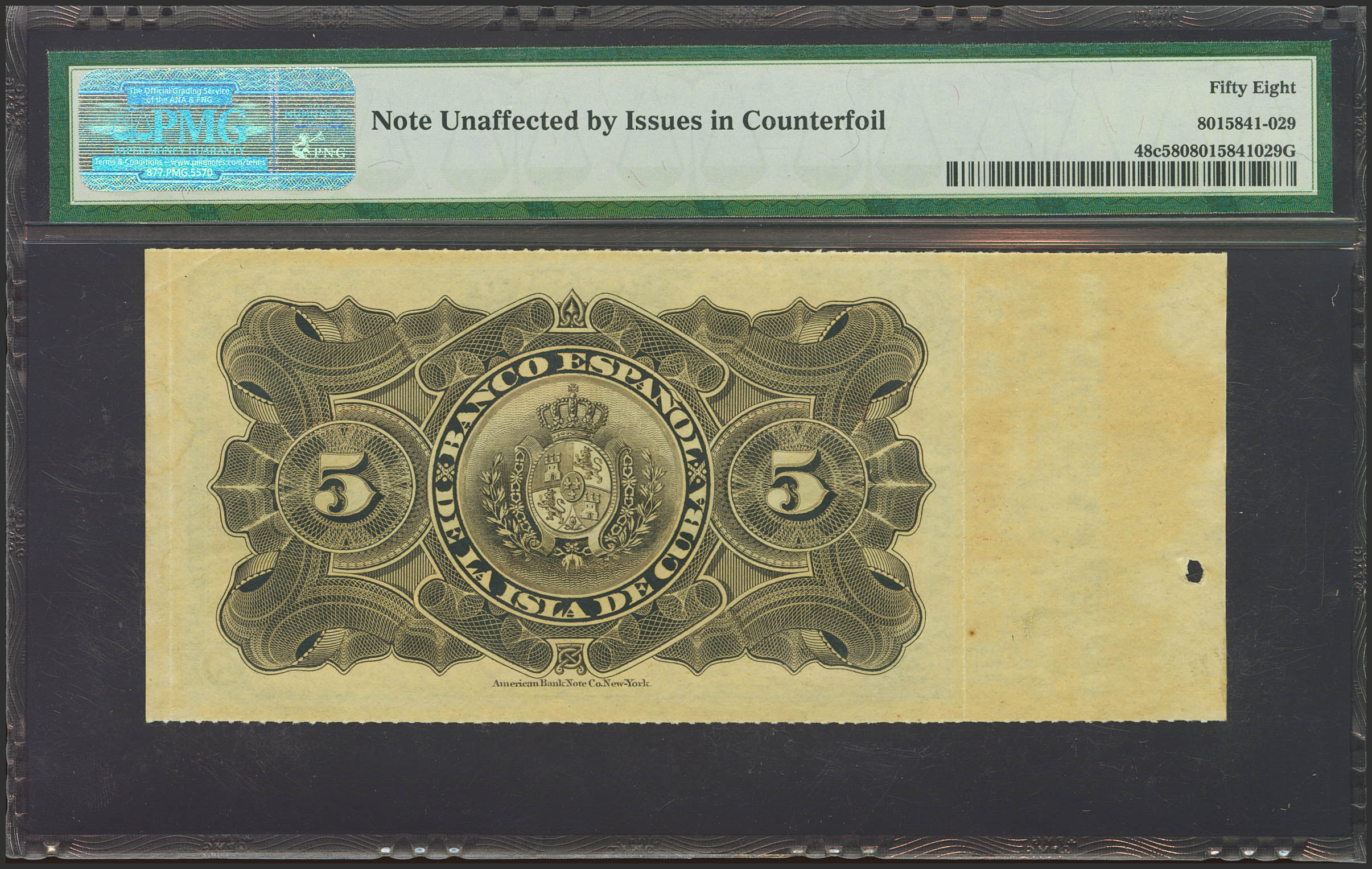 BANCO ESPAÑOL DE LA ISLA DE CUBA. 5 Pesos. 15 de Febrero de 1897. Serie F, matriz a la izquierda. (Edifil 2023: 72, Pick: 48c). Rarísimo con la matriz. EBC+++. Encapsulado PMG58 (note unaffected by issues in counterfoil).