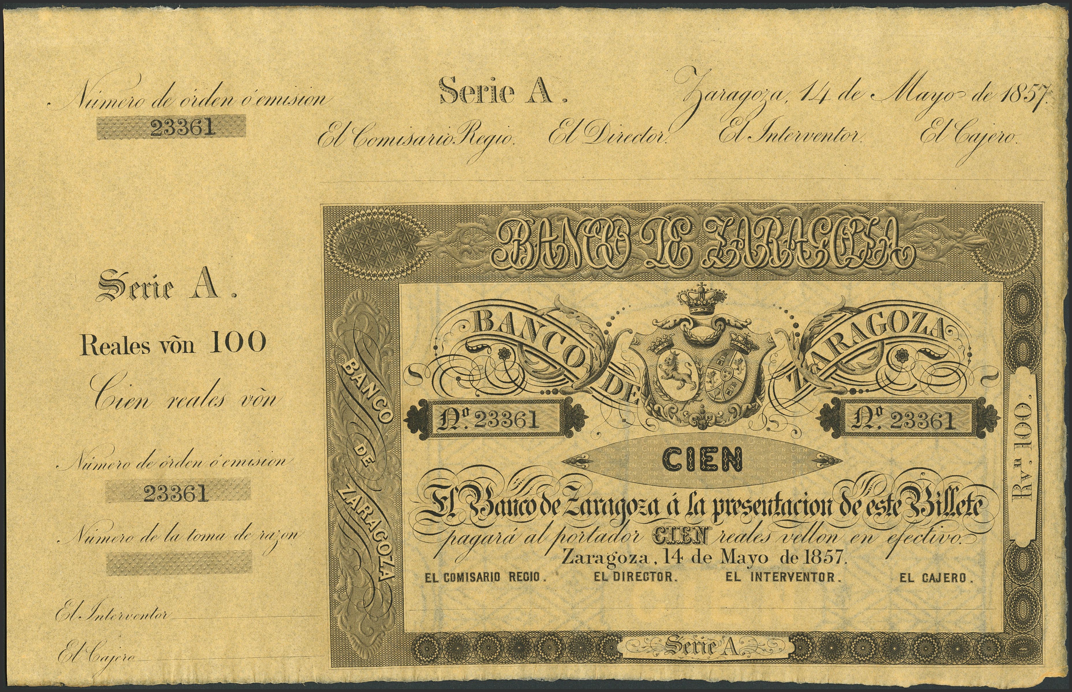 100 Reales. 14 de Mayo de 1857. Banco de Zaragoza. Serie A y con matriz. (Edifil 2023: 126B). Apresto original. SC-.