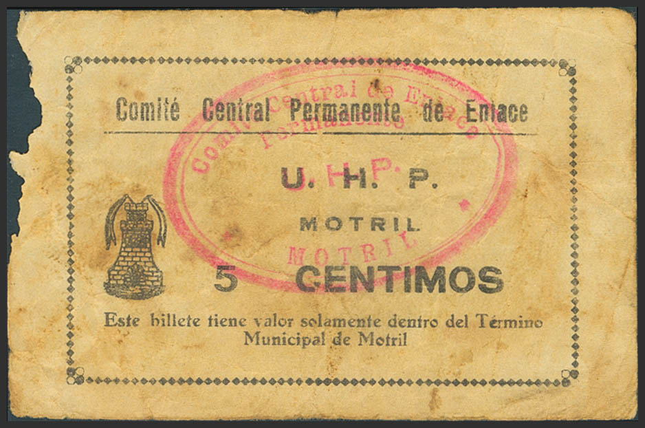 MOTRIL (GRANADA). 5 Céntimos. (1937ca). Comité Central Permanente de Enlace. (González: 3742). Muy raro. MBC-.