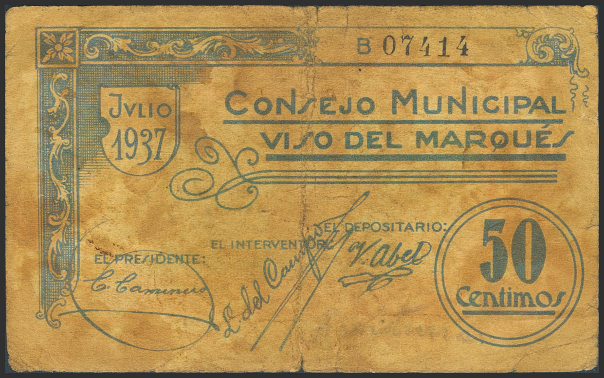 VISO DEL MARQUES (CIUDAD REAL). 50 Céntimos. Julio de 1937. Serie B. (González: 5784). Raro. BC.